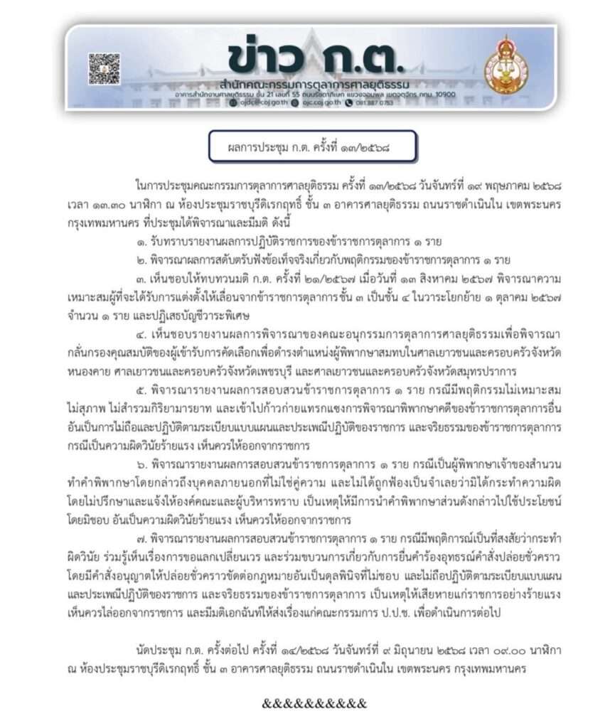 เมื่อวันที่ 20 พ.ค.2568 ผู้สื่อข่าว สำนักข่าวไทยแทบลอยด์ รายงานว่า เมื่อวันที่ 19 พฤษภาคม 2568 ที่ประชุมคณะกรรรมการตุลาการศาลยุติธรรม (ก.ต.) มีวาระสำคัญในการพิจารณารายงานผลการสอบสวนข้าราชการตุลาการ จำนวน 3 ราย