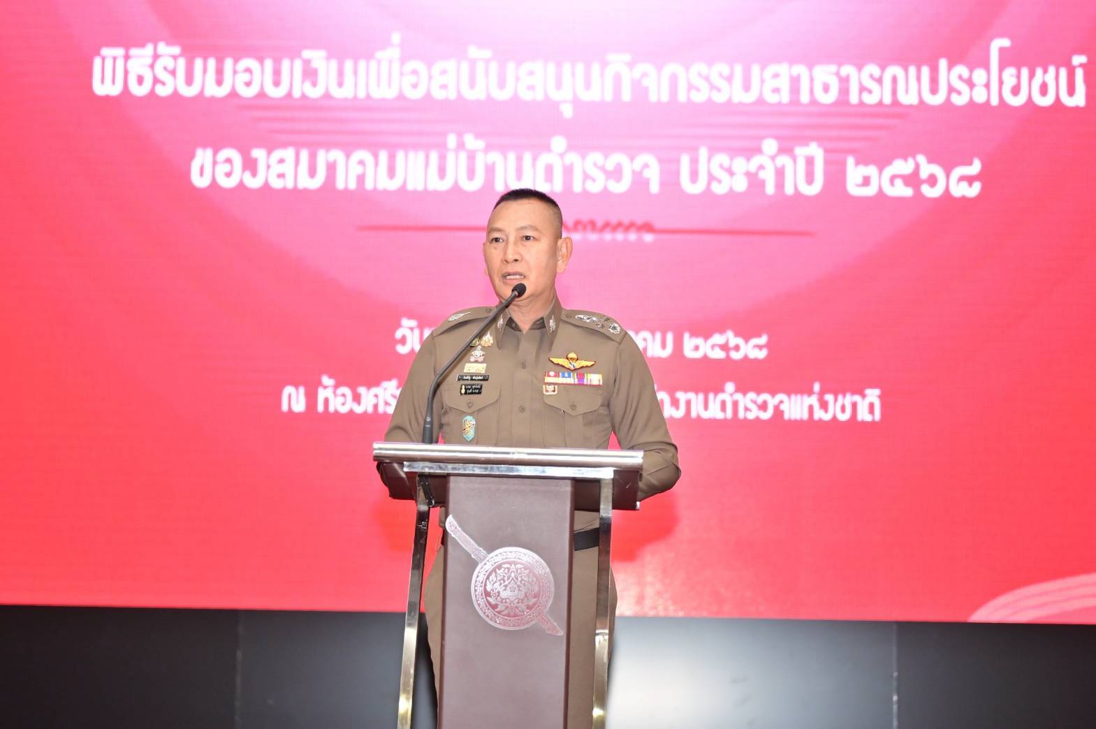 สำหรับพิธีมอบเงินเพื่อสนับสนุนกิจกรรมสาธารณประโยชน์ ของสมาคมแม่บ้านตำรวจ ประจำปี 2568 ผู้บัญชาการตำรวจแห่งชาติ พร้อมด้วย คุณกนกวรรณ พันธุ์เพ็ชร์ นายกสมาคมแม่บ้านตำรวจ เป็นประธานรับมอบเงินสนับสนุนจากหน่วยงานหน่วยงานต่าง ๆ โดยมีผู้บังคับบัญชาระดับสูงของสำนักงานตำรวจแห่งชาติ พร้อมด้วย คุณอาภิพร ชูวงศ์ อุปนายกสมาคมแม่บ้านตำรวจ , คุณนภัสนันท์ วุฒิจรัสธำรงค์ อุปนายกสมาคมแม่บ้านตำรวจ และคุณศิริเพ็ญ ตั้งทวีสุโข นวลมา กรรมการบริหารสมาคมแม่บ้านตำรวจ , คุณชนาพร ไกรทอง , คุณลภัทธิตา จินตกานนท์ กรรมการบริหารสมาคมแม่บ้านตำรวจ , คุณมนสิการ สำราญสำรวจกิจ กรรมการบริหารสมาคมแม่บ้านตำรวจ ร่วมพิธี โดยรับมอบจากผู้สนับสนุนจำนวน 4 หน่วยงาน ได้แก่