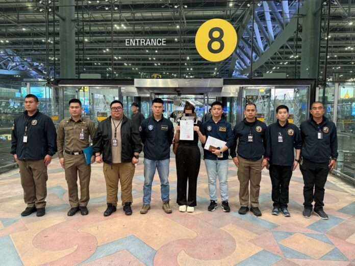เมื่อวันที่ 21 พ.ค.2568 เวลาประมาณ 15.50 น. กก.สส.ปป.บก.ตม.2 ได้รับการประสานจาก กก.2 บก.สอท.3 ว่า นางสาวรัชนีวรรณ อายุ 30 ปี สัญชาติไทย เป็นบุคคลตามหมายจับศาลจังหวัดขอนแก่น ในความผิดฐาน “ร่วมกันจัดให้มีการเล่น หรือทำอุบายล่อ ช่วยประกาศโฆษณาหรือชักชวนโดยตรงหรือทางอ้อมให้ผู้อื่นเข้าเล่นหรือเข้าพนันในการเล่นพนันทางสื่ออิเล็กทรอนิกส์โดยมิได้รับอนุญาตจากเจ้าพนักงาน และสมคบโดยตกลงกันตั้งแต่สองคนขึ้นไปเพื่อกระทำผิดความผิดฐานฟอกเงินและได้มีการกระทำความผิดฐานฟอกเงินเพราะเหตุที่ได้มีการสมคบกัน และร่วมกันฟอกเงิน” ทาง กก.2 บก.สอท.3 ได้แจ้งข้อมูลเพิ่มเติมว่า จากการตรวจสอบเบื้องต้นพบว่ามีเงินหมุนเวียนในบัญชีที่เกี่ยวข้องกับผู้ต้องหากว่า 10 ล้านบาท โดยได้รับแจ้งว่าบุคคลดังกล่าวจะเดินทางออกนอกราชอาณาจักรผ่านท่าอากาศยานสุวรรณภูมิ ด้วยสายการบิน CATHAY PACIFIC เที่ยวบินที่ CX706 เส้นทาง BKK – HKG ในวันเดียวกัน และขอให้ดำเนินการติดตามจับกุม รวมถึงบันทึกข้อมูลในระบบสารสนเทศ สตม.