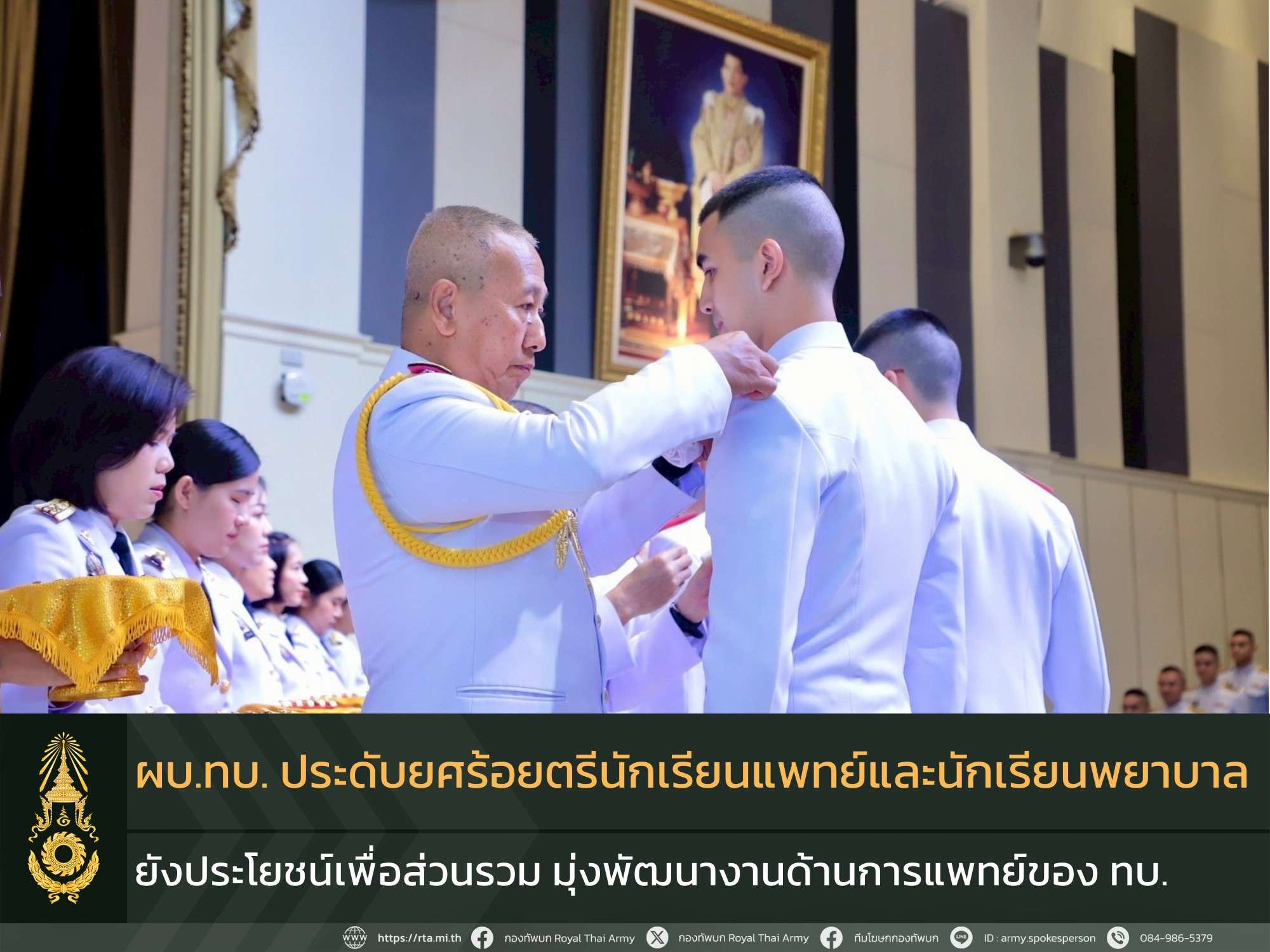ผบ.ทบ. ประดับยศร้อยตรีนักเรียนแพทย์และนักเรียนพยาบาล กำชับปฏิบัติหน้าที่ยังประโยชน์ส่วนรวมและประเทศชาติ พร้อมมุ่งพัฒนางานด้านการแพทย์ของกองทัพบก