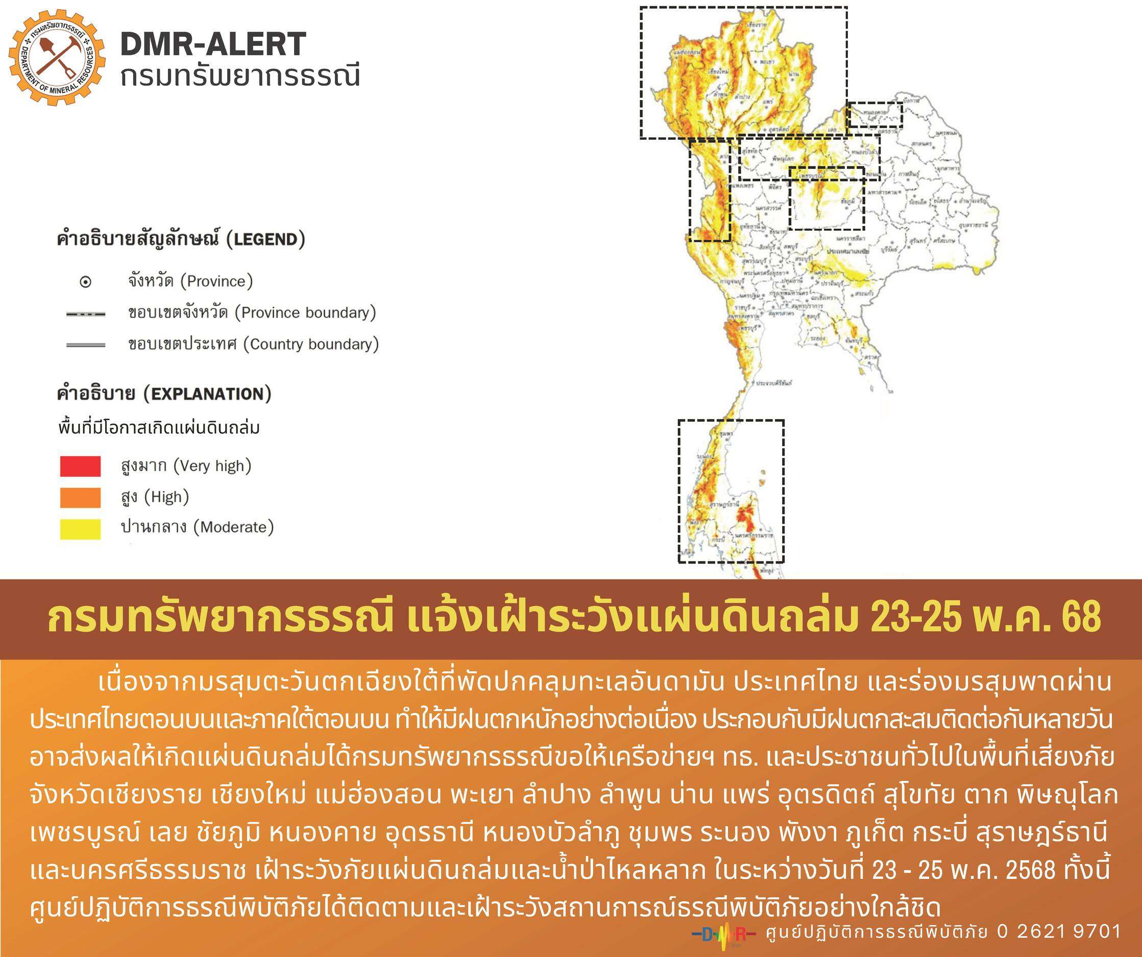 กรุงเทพฯ – วันที่ 23 พ.ค. กรมทรัพยากรธรณี (ทธ.) กระทรวงทรัพยากรธรรมชาติและสิ่งแวดล้อม ออกประกาศขอให้อาสาสมัครเครือข่ายในพื้นที่จังหวัดเชียงใหม่ เชียงราย แม่ฮ่องสอน พะเยา ลำปาง ลำพูน น่าน แพร่ อุตรดิตถ์ สุโขทัยทัย ตาก พิษณุโลก เพชรบูรณ์ เลย ชัยภูมิ หนองคาย อุดรธานี หนองบัวลำภู ชุมพร ระนอง พังงา กระบี่ ภูเก็ต สุราษฎร์ธานี และนครศรีธรรมราช เฝ้าระวังภัยแผ่นดินถล่มและน้ำป่าไหลหลาก ในระหว่างวันที่ 23 – 25 พฤษภาคม 2568 และขอให้เครือข่ายฯ ทธ. วัดปริมาณน้ำฝนอย่างต่อเนื่อง ทั้งนี้ ศูนย์ปฏิบัติการธรณีพิบัติภัย จะติดตามสถานการณ์อย่างใกล้ชิด
