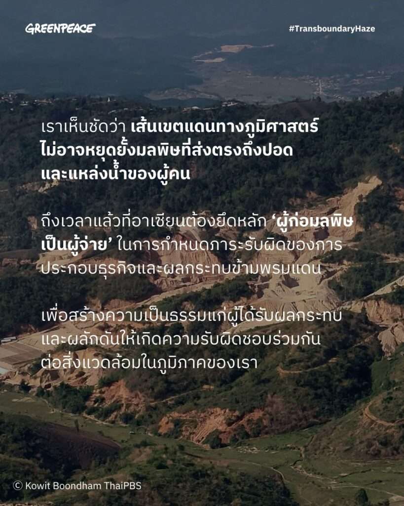 ด้าน รัตนศิริ กิตติก้องนภางค์ จาก กรีนพีซ ประเทศไทย หนึ่งในตัวแทนจากประเทศไทยเข้าร่วมพูดในเวทีคู่ขนานของภาคประชาสังคม (ASEAN Peoples’ Forum) กล่าวว่า “วันนี้อาเซียนไม่สามารถเพิกเฉยต่อเสียงของประชาชนที่ได้รับผลกระทบจากมลพิษข้ามพรมแดนได้อีกต่อไป ไม่ว่าจะเป็นฝุ่นพิษจากการเผาในประเทศเพื่อนบ้าน หรือน้ำปนเปื้อนสารเคมีจากเหมืองในรัฐฉานที่ไหลลงแม่น้ำกกในไทย เราเห็นชัดว่า เส้นเขตแดนทางภูมิศาสตร์ไม่อาจหยุดยั้งมลพิษที่ส่งตรงถึงปอดและแหล่งน้ำของผู้คน ถึงเวลาแล้วที่อาเซียนต้องยึดหลัก ‘ผู้ก่อมลพิษเป็นผู้จ่าย’ ในการกำหนดภาระรับผิตของการประกอบธุรกิจและผลกระทบข้ามพรมแดน เพื่อสร้างความเป็นธรรมแก่ผู้ได้รับผลกระทบ และผลักดันให้เกิดความรับผิดชอบร่วมกันต่อสิ่งแวดล้อมในภูมิภาคของเรา”