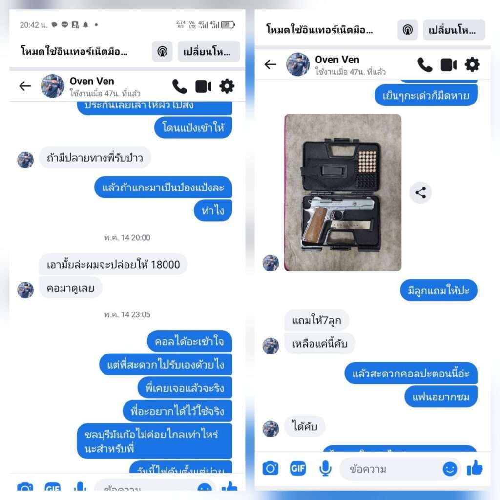 จากนั้นบัญชีเฟซบุ๊กดังกล่าวตกลงขายอาวุธปืนขนาด .380 ให้จำนวน 1 กระบอก ในราคา 18,000 บาท โดยนัดหมายส่งมอบของกันบริเวณซอยตรงข้ามวัดแห่งหนึ่งใน ต.บ่อกวางทอง อ.บ่อทอง จ.ชลบุรี