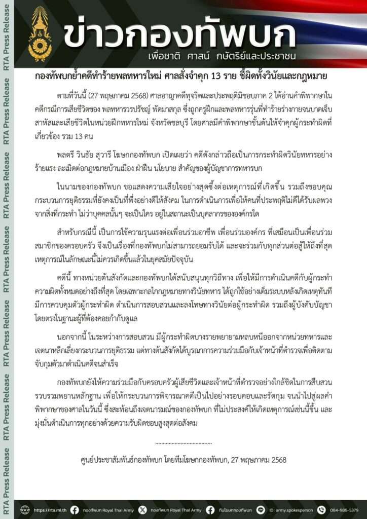 กองทัพบกยังให้ความร่วมมือกับครอบครัวผู้เสียชีวิตและเจ้าหน้าที่ตำรวจอย่างใกล้ชิดในการสืบสวนรวบรวมพยานหลักฐาน เพื่อให้กระบวนการพิจารณาคดีเป็นไปอย่างรอบคอบและรัดกุม จนนำไปสู่ผลคำพิพากษาของศาลในวันนี้ ซึ่งสะท้อนถึงเจตนารมณ์ของกองทัพบก ที่ไม่ประสงค์ให้เกิดเหตุการณ์เช่นนี้ขึ้น และมุ่งมั่นดำเนินการทุกอย่างด้วยความรับผิดชอบสูงสุดต่อสังคม