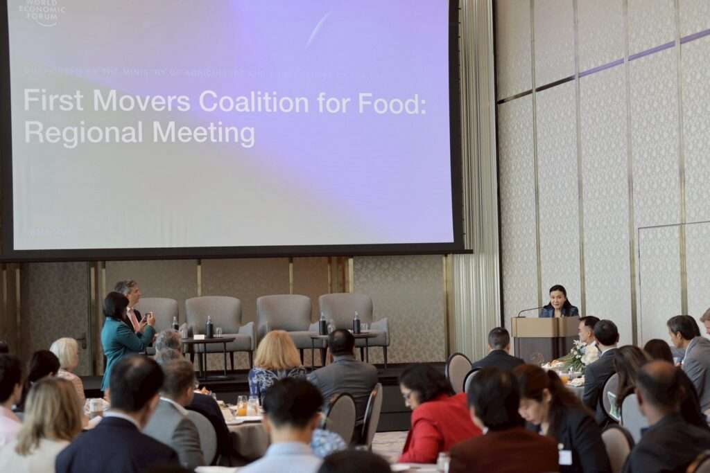 รมว.เกษตรฯ กล่าวว่า สำหรับเวที First Movers Coalition for Food (FMC for Food) เป็นความริเริ่มที่เปิดตัวเมื่อเดือนธันวาคม 2566 โดยเวทีเศรษฐกิจโลก (World Economic Forum) มีเป้าหมายเพื่อใช้พลังของการรวมอุปสงค์ ในการเร่งปรับเปลี่ยนวิธีการผลิตสินค้าเกษตรที่ปล่อยก๊าซเรือนกระจกลดลง โดยเน้นในกลุ่มสินค้าเกษตร 6 ชนิดที่คิดเป็นสัดส่วนสูงถึง 70% ของการปล่อยก๊าซเรือนกระจกจากระบบอาหารโลก ได้แก่ ข้าว พืชไร่ เนื้อวัว นม ถั่วเหลือง และน้ำมันปาล์มโดยภายหลังการเปิดตัวในงาน COP28 เครือข่าย FMC for Food ได้เติบโตจนมีพันธมิตรมากกว่า 50 ราย ครอบคลุมสินค้า 4 กลุ่มหลัก ได้แก่ เนื้อวัว นม ข้าว และพืชไร่ (รวมถึงข้าวสาลี ถั่วเหลือง และข้าวโพด) โดยมุ่งเน้นการพัฒนาเทคโนโลยีและแนวทางการผลิตที่ยั่งยืน ตลอดจนสร้างผลร่วมด้านอื่นๆ เช่น เพิ่มผลผลิต ประหยัดน้ำ และยกระดับคุณภาพชีวิตเกษตรกร