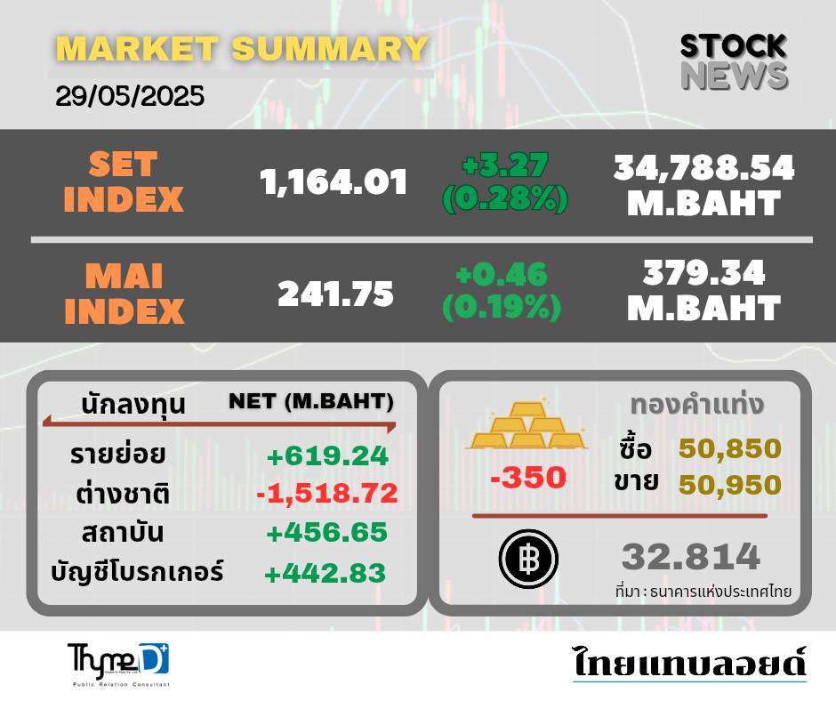 ตลาดหลักทรัพย์ฯ ปิดวันนี้ที่ 1,164.01 จุด เพิ่มขึ้น 3.27 จุด (+0.28%) มูลค่าซื้อขาย 34,788.54 ล้านบาท