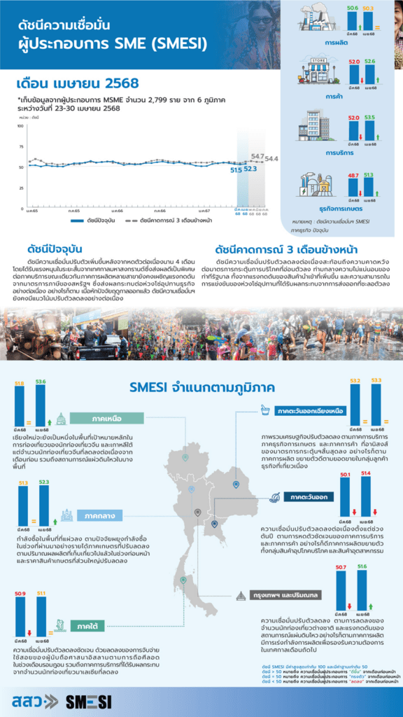 กรุงเพฯ, 30 พ.ค. – นางสาวปณิตา ชินวัตร รองผู้อำนวยการสำนักงาน รักษาการแทนผู้อำนวยการสำนักงานส่งเสริมวิสาหกิจขนาดกลางและขนาดย่อม (สสว.) เปิดเผยดัชนีความเชื่อมั่นผู้ประกอบการ SME (SMESI) ประจำเดือนเมษายน 2568 ว่า อยู่ที่ระดับ 52.3 ปรับตัวเพิ่มขึ้นจากเดือนก่อนหน้าที่ระดับ 51.5 หลังจากหดตัวต่อเนื่องนาน 4 เดือน โดยได้รับแรงหนุนในระยะสั้นจากเทศกาลมหาสงกรานต์ ซึ่งส่งผลดีต่อภาคบริการเป็นพิเศษ แต่ดีไมเท่าปีก่อน เหตุหนึ่งเนื่องจากการเลือกตั้งองค์การปกครองส่วนท้องถิ่น (อปท.) จึงไม่สามารถจัดกิจกรรมได้ ขณะเดียวกัน ภาษีทรัมป์ยังส่งผลกระทบกับภาคการผลิตหลายสาขาอย่างต่อเนื่อง ส่วนภาคธุรกิจการเกษตรปรับตัวดีขึ้น จากการเข้าสู่ช่วงการเก็บเกี่ยวผลผลิตนอกฤดูกาลเพาะปลูก โดยเฉพาะในพื้นที่ภาคกลาง ทั้งนี้ เมื่อหักปัจจัยฤดูกาลออกแล้ว ดัชนีความเชื่อมั่นฯ ยังคงมีแนวโน้มปรับตัวลดลงอย่างต่อเนื่อง