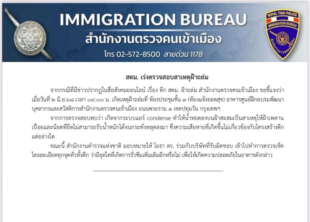 จากกรณีที่มีข่าวปรากฏในสื่อสังคมออนไลน์ เรื่อง ตึก สตม. ฝ้าถล่ม สำนักงานตรวจคนเข้าเมือง ขอชี้แจงว่า เมื่อวันที่ 2 มิ.ย.68 เวลา 09.00 น. เกิดเหตุฝ้าถล่มที่ ห้องประชุมชั้น 3 (ห้องแจ้งยอดสุข) อาคารศูนย์ฝึกอบรมพัฒนาบุคลากรและสวัสดิการสำนักงานตรวจคนเข้าเมือง ถนนพระราม 1 เขตปทุมวัน กรุงเทพฯ