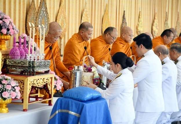 จากนั้น นายกรัฐมนตรีและคู่สมรส รวมทั้ง ประธานศาลฎีกาและคู่สมรส ประธานวุฒิสภา (ผู้แทน ประธานรัฐสภา) ประธานศาลปกครองสูงสุด ประธานกรรมการการเลือกตั้ง ประธานผู้ตรวจการแผ่นดิน ประธานองค์กรตามรัฐธรรมนูญ และส่วนราชการในพระองค์ ถวายผ้าไตรและเครื่องไทยธรรม แด่พระสงฆ์ จำนวน 10 รูป ก่อนที่จะนำผู้เข้าร่วมพิธีร่วมตักบาตรพระสงฆ์ จำนวน 148 รูป