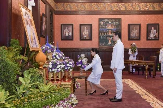 ในนาม “นายกรัฐมนตรีและคู่สมรส” และ คู่สมรสนายกรัฐมนตรี พร้อมภริยารองนายกรัฐมนตรี ทูลเกล้าฯ ถวายแจกันดอกไม้ ก่อนลงนามถวายพระพรชัยมงคล ถวายความเคารพพระฉายาลักษณ์ฯ และเดินทางกลับ