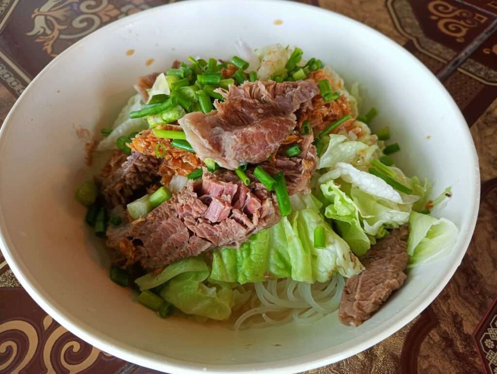 เมนูที่ 3 เส้นเล็กแห้ง เนื้อเปื่อย ที่ลุงต้องสั่งแบบนี้ เพราะลุงมองเห็นเนื้อเปื่อยที่ต้มไว้สำหรับทำก๋วยเตี๋ยว เนื้อน่ากินมาก สั่งเนื้อเปื่อยอย่างเดียว …ม๊ะห์ไม่ขาย ม๊ะห์บอกว่า “กินข้าวซอยก็อร่อยแล้ว” ส่วนเนื้อเปื่อย มีไว้สำหรับทำก๋วยเตี๋ยว เผื่อคนที่กินข้าวซอยไม่เป็น ก็สั่งเป็นก๋วยเตี๋ยวได้ที่นี่ ถ้าอยากกิน ก็ต้องสั่งเป็นก๋วยเตี๋ยวเท่านั้น ลุงก็เลยสั่งเป็นเส้นเล็กแห้ง เพราะต้องการกินเนื้อเปื่อย