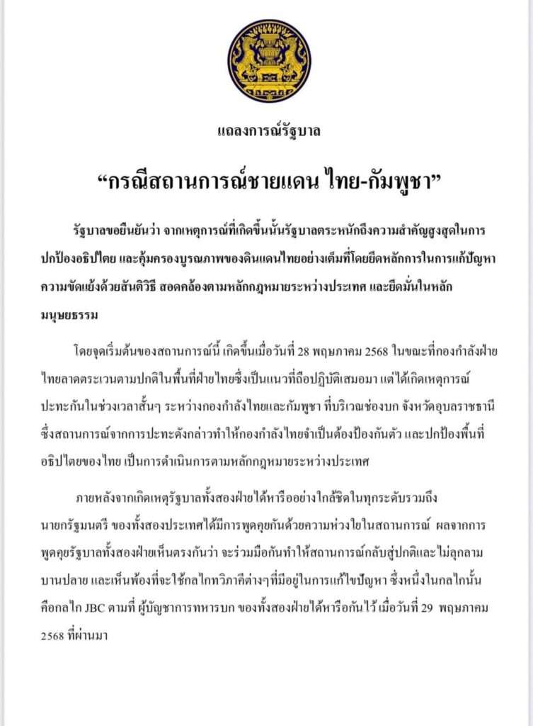 รัฐบาลออกแถลงการณ์ ไทย-กัมพูชา ยืนยันปกป้องอธิปไตยเต็มที่ เดินหน้าใช้เวที JBC GBC และ RBC แก้ปัญหา