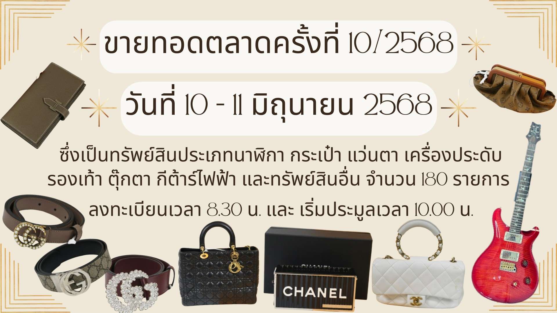 สำนักงาน ปปง. จะทำการขายทอดตลาดทรัพย์สินโดยวิธีการประมูลปากเปล่า ครั้งที่ 10/2568 ซึ่งเป็นทรัพย์สินประเภทกระเป๋าแบรนด์เนม เครื่องประดับ ตุ๊กตาแบร์บริค และทรัพย์อื่น จำนวน 180 รายการ โดยจะทำการขายทอดตลาดทรัพย์สิน ในวันที่ 10-11 มิถุนายน 2568 ลงทะเบียนตั้งแต่เวลา 08.30 น. เริ่มประมูลเวลา 10.00 น. เป็นต้นไป ณ ห้องประชุม 101 ชั้น 1 อาคารสำนักงาน ปปง. โดยมีรายการทรัพย์สินที่น่าสนใจ ดังนี้