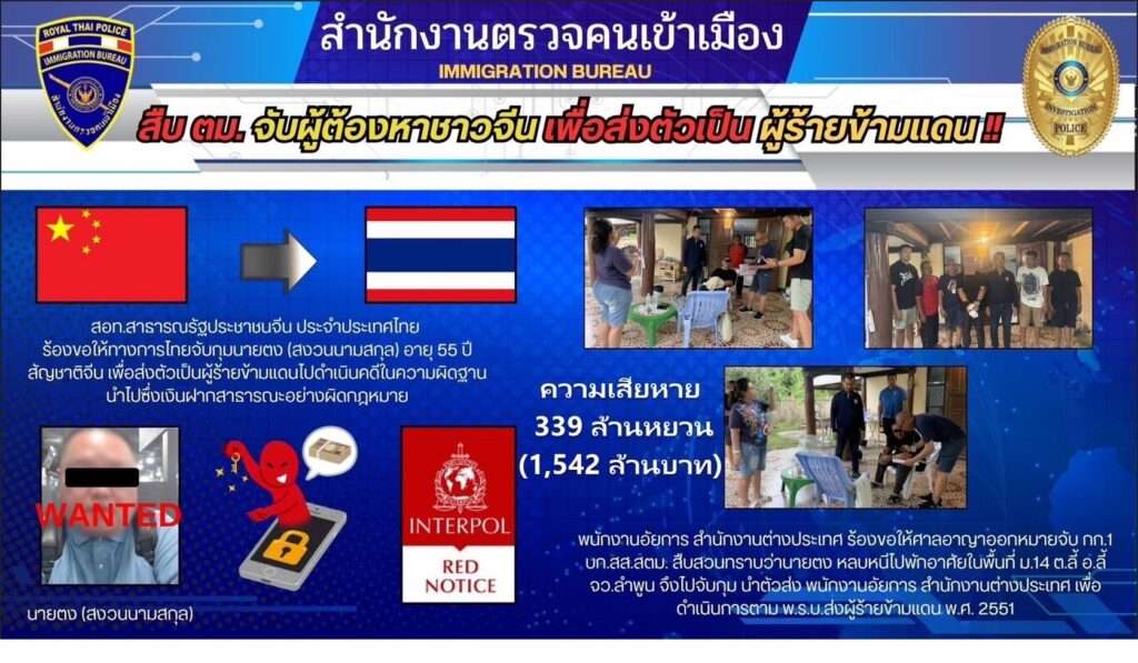 สืบเนื่องจาก สถานเอกอัครราชทูตสาธารณรัฐประชาชนจีน ประจำประเทศไทย ได้มีหนังสือถึงกระทรวงการต่างประเทศแจ้งการร้องขอให้ทางการไทยจับกุมตัวชั่วคราวนายตง (สงวนนามสกุล) อายุ 55 ปี สัญชาติจีน เพื่อส่งตัวเป็นผู้ร้ายข้ามแดนไปดำเนินคดีในความผิดฐานนำไปซึ่งเงินฝากสาธารณะอย่างผิดกฎหมาย ความเสียหายกว่า 339 ล้านหยวน (กว่า 1,542 ล้านบาท) และเป็นบุคคลที่องค์การตำรวจสากลได้ออกประกาศสีแดง (INTERPOL RED NOTICE) ต่อมาพนักงานอัยการ สำนักงานต่างประเทศ ได้ดำเนินการยื่นคำร้องขอให้ออกหมายจับชั่วคราวต่อศาลอาญา และได้ส่งหมายจับมายังสำนักงานตำรวจแห่งชาติเพื่อให้ดำเนินการสืบสวนจับกุม