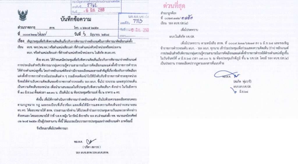 ต่อมา พล.ต.ต.สมกิต พุ่มวารี ผบก.อก.บช.ปส.ได้มีหนังสือด่วนที่สุด ระบุว่า เรียน รอง ผบช.ปส.เพื่อโปรดทราบ ผบก.ในสังกัด บช.ปส.เพื่อโปรดทราบ ตามหนังสือ สกพ. ที่ 0009.231/6617ลง 6 มิ.ย.68 และขอเชิญข้าราชการตำรวจระดับ ผบก. – รอง ผบก. ทุกนาย เข้าร่วมประชุมเพื่อร่วมแสดงความคิดเห็น (ร่าง) หลักเกณฑ์การประเมินสำหรับพิจารณากลุ่มความรู้ความสามารถในการคัดเลือกและแต่งตั้งข้าราชการตำรวจให้ดำรงตำแหน่งที่สูงขึ้น ในวันจันทร์ที่ 9 มิ.ย.68 เวลา 09.00 น. ที่ห้องประชุมภักดีภูมิ ชั้น 2 บช.ปส. โดยมี รอง ผบช.ปส.เป็นประธาน รายละเอียดปรากฏตามเอกสารที่แนบท้าย “หนังสือคำสั่งระบุ