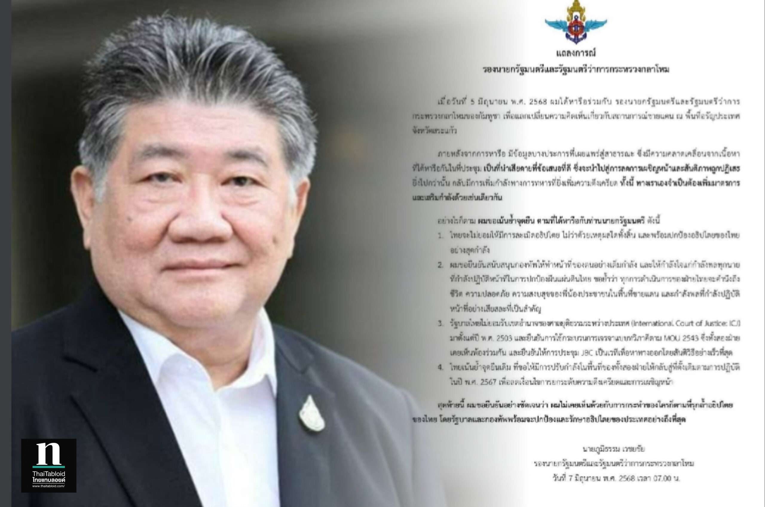 วันที่ 7 มิ.ย.68 – นายภูมิธรรม เวชยชัย รองนายกรัฐมนตรี ออกแถลงการณ์ต่อกรณีข้อพิพาทชายแดนไทย-กัมพูชา ว่า เมื่อวันที่ 5 มิถุนายน พ.ศ. 2568 ผมได้หารือร่วมกับ รองนายกรัฐมนตรีและรัฐมนตรีว่าการกระทรวงกลาโหมของกัมพูชา เพื่อแลกเปลี่ยนความคิดเห็นเกี่ยวกับสถานการณ์ชายแดน ณ พื้นที่อรัญประเทศ จังหวัดสระแก้ว