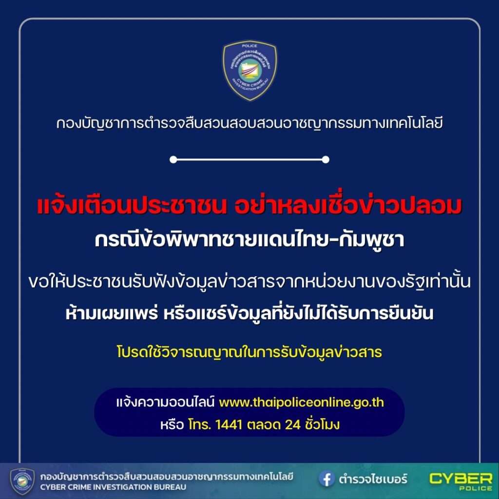 ตำรวจไซเบอร์แจ้งเตือนประชาชน! อย่าหลงเชื่อ ข่าวปลอม กรณีข้อพิพาทชายแดนไทย-กัมพูชา