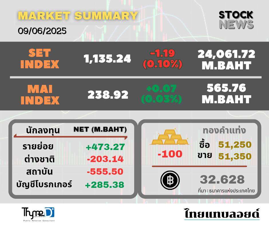 SET ปิดวันนี้ที่ 1,135.24 จุด ลดลง 1.19 จุด (-0.10%) มูลค่าซื้อขาย 24,061.72 ล้านบาท นักวิเคราะห์ฯ ระบุตลาดหุ้นไทยแกว่งกรอบแคบ-วอลุ่มบาง เกาะติดการเจรจาการค้าสหรัฐ-จีนสัปดาห์นี้ และประเด็นการเมืองในประเทศยังคงร้อนแรง โดยเฉพาะวันที่ 13 มิ.ย.ศาลฎีกาแผนกคดีอาญาฯ นัดไต่สวนกรณีนายทักษิณ ชินวัตร พักรักษาตัวชั้น 14 รพ.ตำรวจ ขณะที่มองแนวโน้มผลการดำเนินงาน บจ.ไตรมาส 2/68 อ่อนตัว พรุ่งนี้คาดตลาดยังแกว่งในกรอบแคบต่อไป พร้อมให้แนวรับที่ 1,120 จุด แนวต้านที่ 1,155 จุด