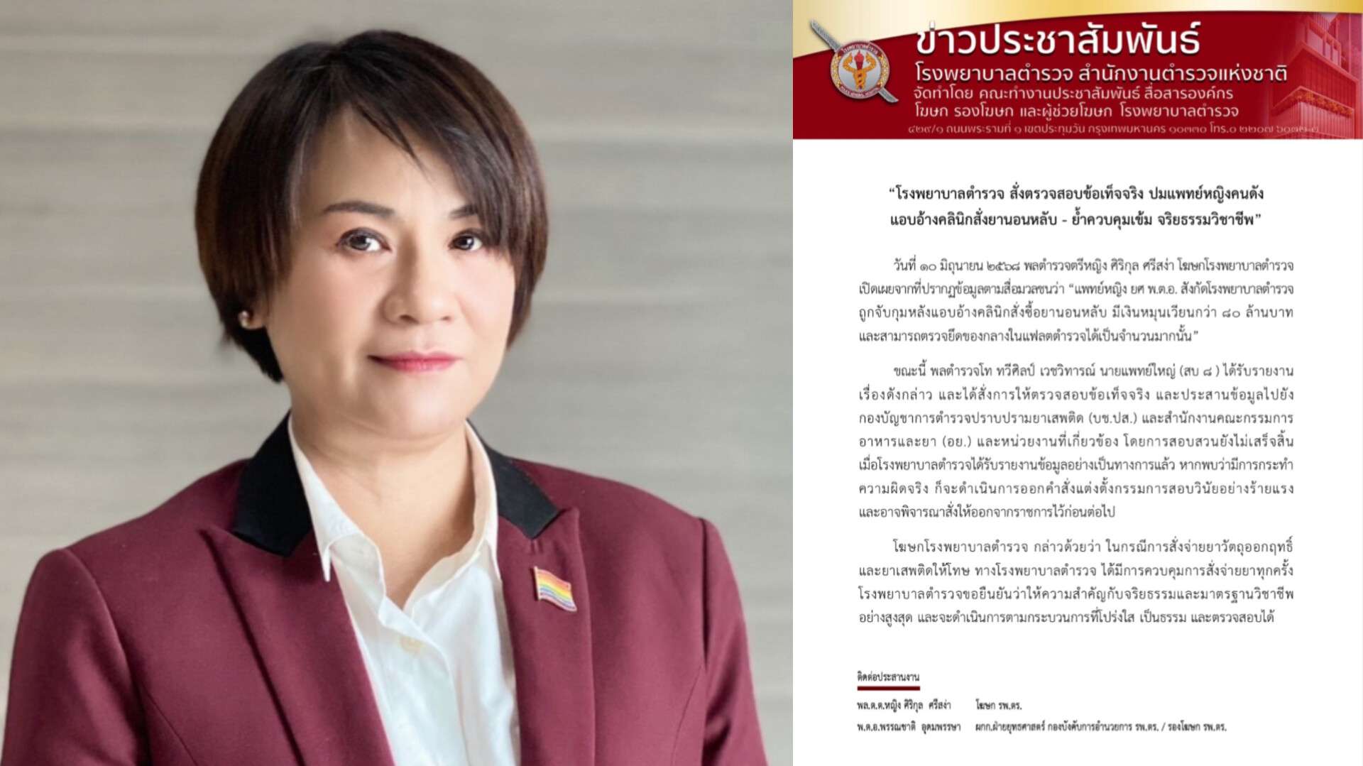 รพ.ตร.สั่งตรวจสอบข้อเท็จจริง ปมแพทย์หญิงคนดังแอบอ้างคลินิกสั่งยานอนหลับ ย้ำควบคุมเข้ม จริยธรรมวิชาชีพ