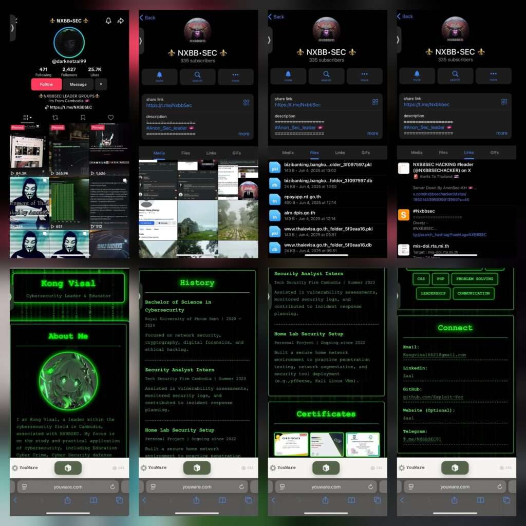 จากนั้นได้ตรวจสอบบัญชี TikTok ของนางสาว Hak Srey Net (TikTok:@haksreynethsobatter) พบว่าได้เผยแพร่เนื้อหาสนับสนุนการกระทำความผิดของกลุ่ม“⚜️ NXBB•SEC ⚜️” และเชิญชวนให้ติดตาม Telegram Channel ของกลุ่มดังกล่าว ซึ่งสอดคล้องกับหลักฐานใน Facebook และ YouWare Portfolio จึงสรุปได้ว่า “Kong Visal” ศิษย์เก่าหลักสูตรปริญญาตรีสาขา Cybersecurity จาก Royal University of Phnom Penh รุ่นปี 2020 – 2024 และ Hak Srey Net ได้ร่วมกันวางแผนและสนับสนุนการกระทำความผิดผ่านช่องทางโซเชียลมีเดีย