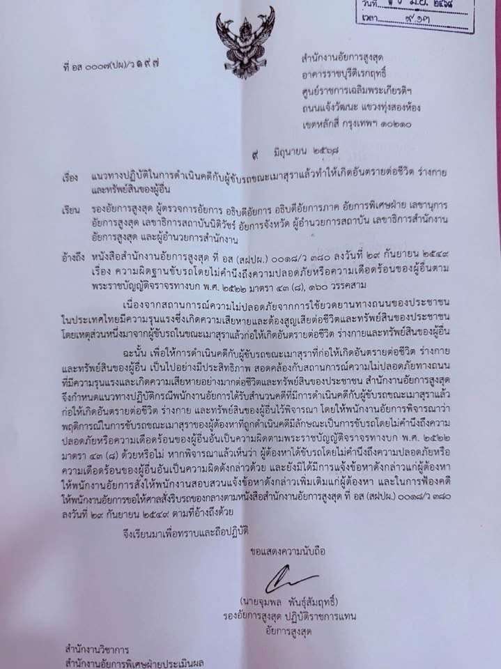 เมื่อวันที่ 10 มิถุนายน 2568 ที่สำนักงานอัยการสูงสุด อาคารราชบุรีดีเรกฤทธิ์ศูนย์ราชการเฉลิมพระเกียรติฯ ผู้สื่อข่าวไทยแทบลอยด์รายงานว่า นายจุมพล พันธุ์สัมฤทธิ์ รองอัยการสูงสุด ปฏิบัติราชการแทนอัยการสูงสุด ได้มีหนังสือคำสั่งลงวันที่ 9 มิถุนายน 2568 เรื่องแนวทางปฏิบัติในการดำเนินคดีกับผู้ขับรถขณะเมาสุราแล้วทำให้เกิดอันตรายต่อชีอชีวิตและทรัพย์สินของผู้อื่น ถึง รองอัยการสูงสุด ผู้ตรวจการอัยการ อธิบดีอัยการ อธิบดีอัยการภาค อัยการพิเศษฝ่าย เลขานุการอัยการสูงสุด เลขาธิการสถาบันนิติวัชร์ อัยการจังหวัด ผู้อำนวยการสถาบัน เลขาธิการอัยการสูงสุด และผู้อำนวยการสำนักงาน