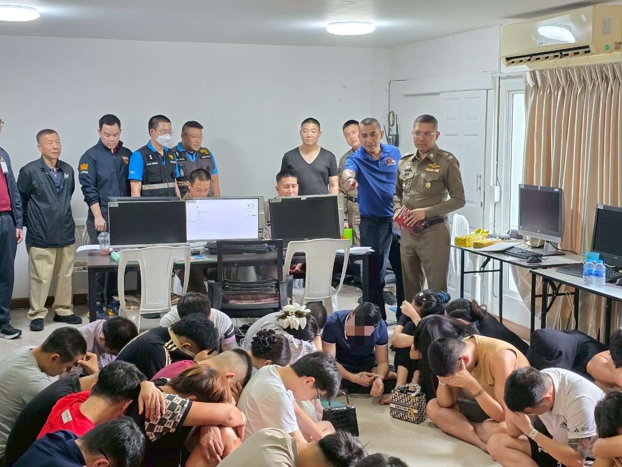 พล.ต.ต.นพศิลป์ กล่าวว่า ตำรวจ 191 ได้รับร้องเรียกจากประชาชนว่าพบกลุ่มชาวต่างชาติจับกลุ่มมั่วสุมกันเป็นจำนวนมาก ตำรวจสายตรวจ 191 จึงได้ลงพื้นที่ตรวจสอบและสืบสวนพบว่ามีบุคคลต่างด้าวเช่าบ้านจำนวน 2 หลัง ในหมู่บ้านหรูย่านชานเมือง และมีพฤติกรรมน่าสงสัยจึงได้ทำการขอหมายค้นเพื่อทำการเข้าตรวจสอบ โดยหลังแรกพบบุคคลต่างด้าว 18 ราย และ หลังที่สองอีก 9 ราย เป็นหญิง 5 ราย และ ชาย 22 ราย รวมทั้งสิ้น 27 ราย พร้อมของกลาง โทรศัพท์มือถือ 116 เครื่อง คอมพิวเตอร์ 45 เครื่อง และยาเสพติด (เคตามีน) 5 กรัม