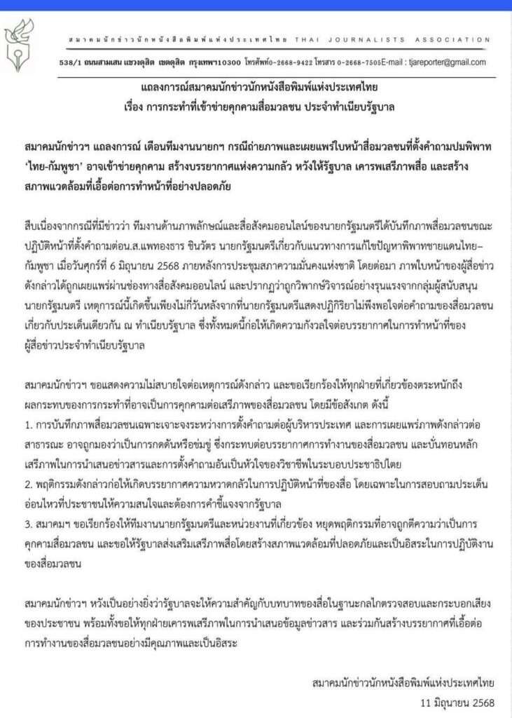 เมื่อวันที่ 11 มิถุนายน 2568 สมาคมนักข่าวนักหนังสือพิมพ์แห่งประเทศไทย ได้มีหนังสือแถลงการณ์สมาคมนักข่าวนักหนังสือพิมพ์แห่งประเทศไทย เรื่อง การกระทำที่เข้าข่ายคุกคามสื่อมวลชน ประจำทำทำเนียบรัฐบาล สมาคมนักข่าวฯ แถลงการณ์ เตือนทีมงานนายกฯ กรณีถ่ายภาพและเผยแพร์ใบหน้าสื่อมวลชนที่ตั้งคำถามาถามปมพิพาท’ไทย-กัมพูชา’ อาจเข้าข่ายคุกคาม สร้างบรรยากาศแห่งความกลัว หวังให้รัฐบาล เคารพเสร็ภาพสื่อ และสร้างสภาพแวดล้อมที่เอื้อต่อการทำหน้าที่อย่างปลอดภัยสืบเนื่องจากกรณีที่มีข่าวว่า ทีมงานด้านภาพลักษณ์และสื่อสังคมออนไลน์ของนายกรัฐมนตรีได้บันทึกภาสื่อมวลชนขณะปฏิบัติหน้าที่ตั้งคำถามต่อน.ส.แพทองธาร ชินวัตร นายกรัฐมนตรีเกี่ยวกับแนวทางการแก้ไขปัญหาพิพาทชายแดนไทย-กัมพูชา เมื่อวันศุกร์ที่ 6 มิถุนายน 2568 ภายหลังการประชุมสภาความมั่นคงแห่งชาติ โดยต่อมา ภาพใบหน้าของผู้สื่อข่าว