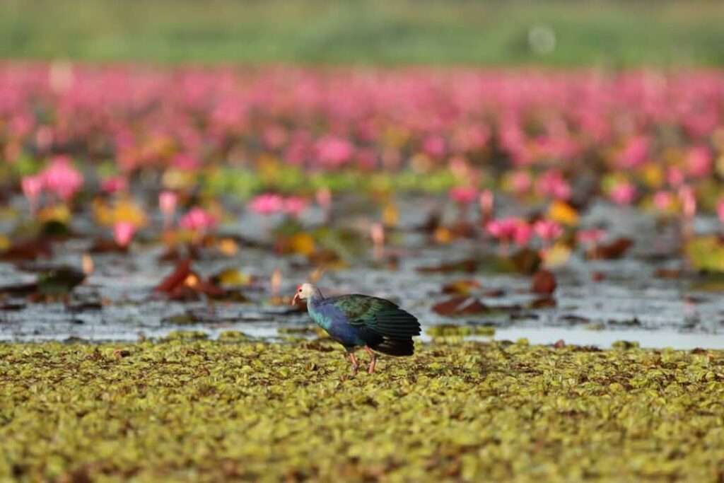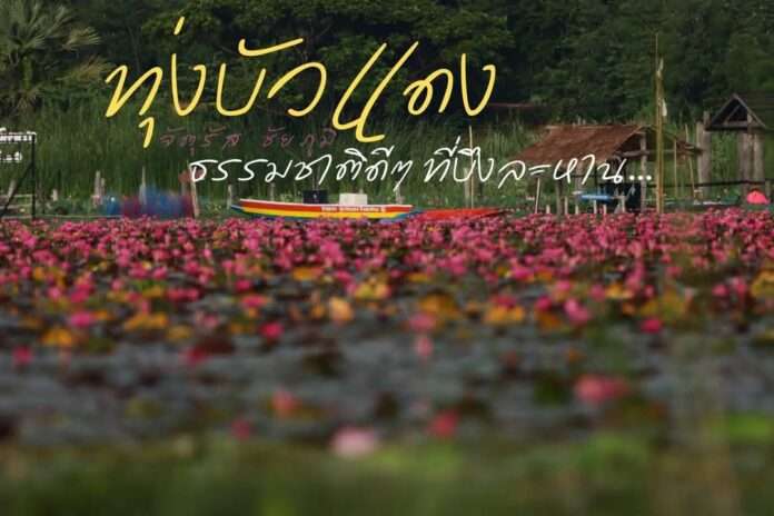เมื่อแสงแรกของวันส่องผ่านใบไผ่ริมบึง ภาพที่ปรากฏต่อหน้าคือทะเลสีชมพูแดงที่ไร้ขอบเขต ดอกบัวนับล้านดวงผลิบานพร้อมกันราวกับธรรมชาติได้เทสีสันอันงดงามลงบนผืนผ้าใบขนาดยักษ์ เสียงคลื่นน้ำที่เซาะเซาใบบัวเบาๆ ผสานกับเสียงนกร้องแสนไพเราะ สร้างบรรยากาศอันเงียบสงบที่ทำให้จิตใจผ่อนคลาย