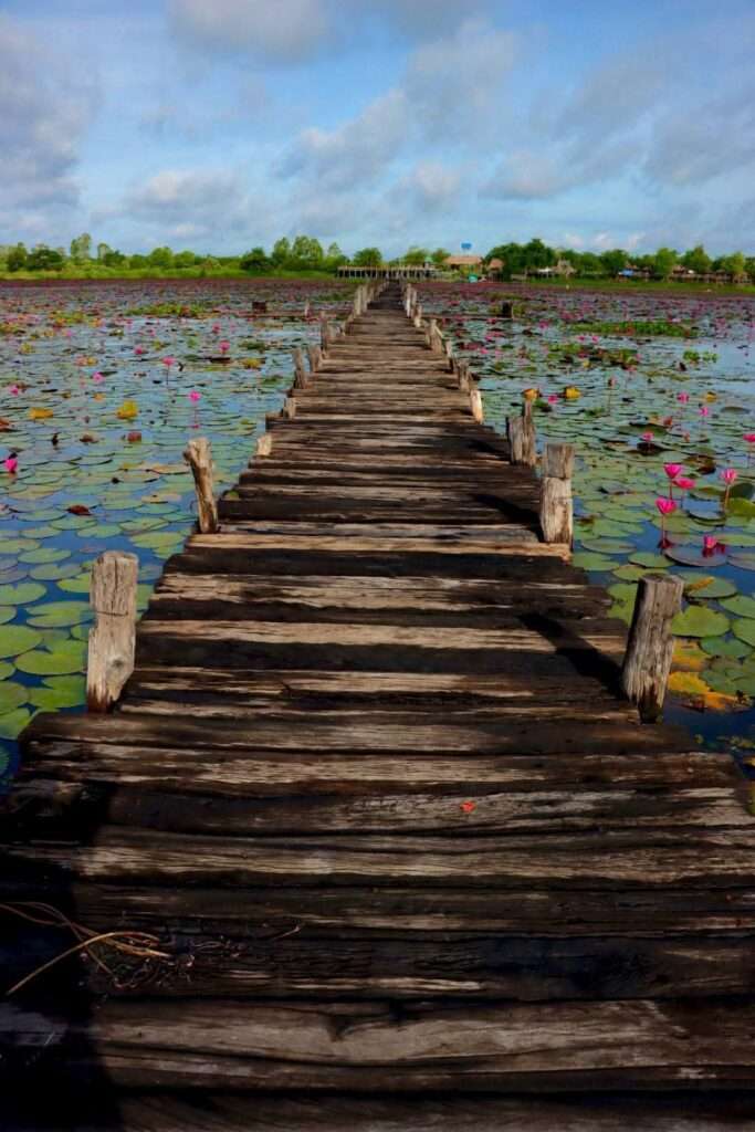 หนึ่งในประสบการณ์ที่น่าประทับใจที่สุดคือการนั่งเรือพายเล็กๆ ลอยไปในทะเลดอกบัว เรือไม้สีสันสดใสที่มีคนพายชาวบ้านจะพาคุณร่อนไปในเส้นทางที่ไม่เคยเห็นที่ไหน รอบตัวล้อมด้วยดอกบัวแดงที่สูงชิดเรือ ใกล้จนสามารถสัมผัสกลีบบัวนุ่มๆ ได้ด้วยปลายนิ้ว