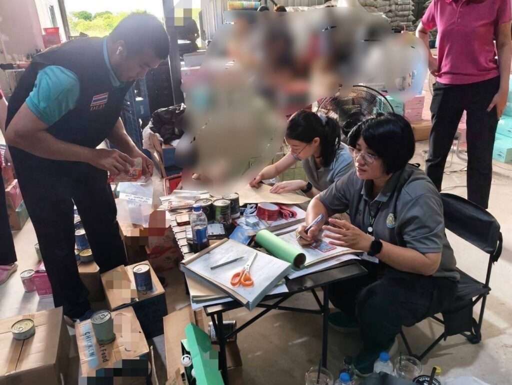 เจ้าหน้าที่ดำเนินการล่อซื้อและสืบสวนจนทราบที่ตั้ง ก่อนลงพื้นที่ตรวจสอบ พบโกดังขนาดใหญ่ มีพนักงานประมาณ 10 คน ตรวจพบอาหารสัตว์เลี้ยงหลากหลายประเภท ทั้งชนิดเม็ด ชนิดเปียก และขนมแมวเลีย โดยไม่พบเอกสารอนุญาตนำเข้าเพื่อจำหน่าย และไม่มีการขึ้นทะเบียนอาหารสัตว์ควบคุมเฉพาะ ตามที่กฎหมายกำหนดการกระทำดังกล่าวเข้าข่ายฝ่าฝืนพระราชบัญญัติควบคุมคุณภาพอาหารสัตว์ พ.ศ. 2558 โดยมีความผิด 2 ฐาน ได้แก่ มาตรา 15 ไม่มีใบอนุญาตนำเข้าอาหารสัตว์ควบคุมเฉพาะ มีโทษตาม มาตรา 74 จำคุกไม่เกิน 3 ปี หรือปรับไม่เกิน 60,000 บาท หรือทั้งจำทั้งปรับ และมาตรา 56 (4) จำหน่ายอาหารสัตว์ที่ต้องขึ้นทะเบียนโดยมิได้ขึ้นทะเบียน มีโทษตามมาตรา 86 วรรคแรก จำคุก 1–5 ปี หรือปรับ 20,000–100,000 บาท หรือทั้งจำทั้งปรับ