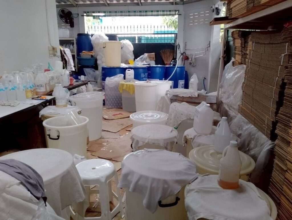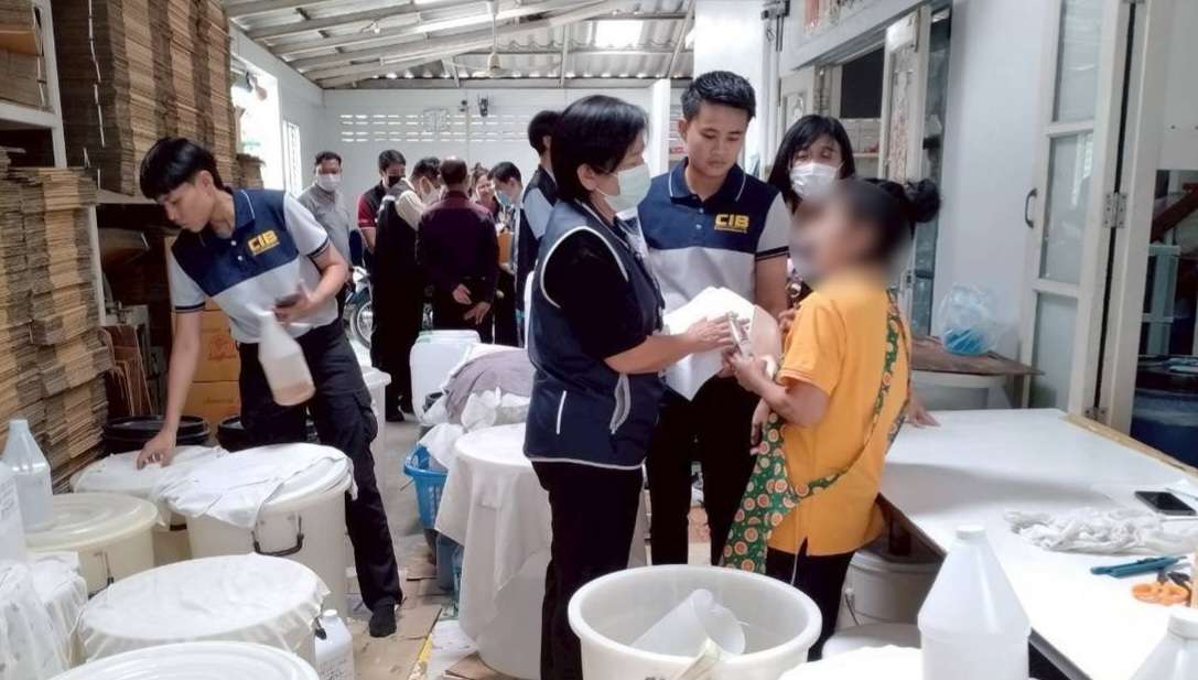 ต่อมาวันที่ 12 มิถุนายน 2568 เจ้าหน้าที่ตำรวจ กก.4 บก.ปคบ. จึงได้ร่วมกับเจ้าหน้าที่จาก สำนักงานสาธารณสุขจังหวัดนนทบุรี นำหมายค้นของศาลแขวงนนทบุรี เข้าตรวจค้นสถานที่ผลิต ภายในบ้านพักอาศัย พื้นที่หมู่ที่ 1 ต.พิมลราช อ.บางบัวทอง จ.นนทบุรี พบ นายมนตรี (สงวนนามสกุล) อายุ 46 ปี เป็นผู้นำตรวจค้น ขณะเข้าตรวจค้นพบแรงงาน กำลังผลิตเครื่องสำอาง ด้วยการกรอกมือใส่ขวดเพื่อนำออกขายให้กับประชาชน ตรวจยึดของกลาง ได้แก่ ผลิตภัณฑ์เครื่องสำอางยี่ห้อเลดี้ฟลาวเวอร์ สำหรับใช้ในร้านนวดสปารูปแบบต่าง ได้แก่ น้ำมันนวดสปา น้ำมันมะพร้าว ผงสมุนไพรขัดหน้า/ขัดตัว ครีมขัดหน้า ขัดผิว ล้างหน้า นวดหน้า สมุนไพร แอนด์ สปา ผลิตภัณฑ์เครื่องสำอางบรรจุเสร็จพร้อมขาย จำนวน 22 รายการ รวมกว่า 2,378 ชิ้น วัตถุดิบที่ใช้ผลิต โลชั่นและน้ำมันออยล์สำหรับรอการบรรจุ บรรจุอยู่ในถัง หัวน้ำหอม และผงสมุนไพร รวมจำนวน 47 รายการ รวม 202 ชิ้นอุปกรณ์การผลิต ได้แก่ ขวดเปล่า กระปุกเปล่า ฝา สติกเกอร์ฉลาก ลังลูกฟูก เครื่องปั้มวันที่ เครื่องเป่าลมร้อน รัดฟิล์ม อุปกรณ์ในการผลิตจำนวน 142 รายการ รวมกว่า 773,772 ชิ้น ตรวจยึดของกลาง รวมจำนวน 211 รายการ จำนวนกว่า 776,352 ชิ้น มูลค่ากว่า 1,500,000 บาท ส่งพนักงานสอบสวน กก.4 บก.ปคบ.