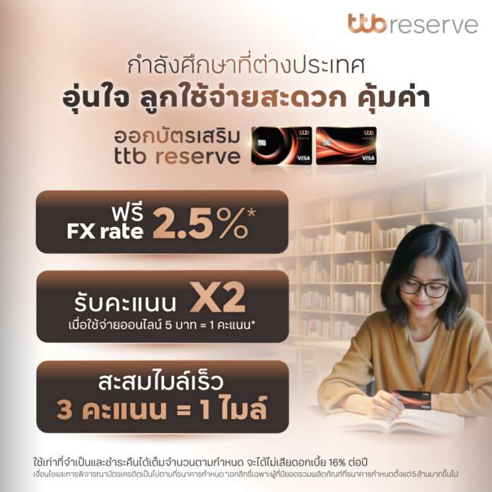 · ลูกกำลังศึกษาอยู่ต่างประเทศ ออกบัตรเครดิตเสริม ttb reserve ให้ลูกใช้จ่ายอย่างสะดวก พร้อมควบคุมวงเงินได้ ฟรี FX rate 2.5% รับคะแนน X2 ทุกยอดใช้จ่ายออนไลน์ (5 บาท = 1 คะแนน) สะสมไมล์เร็ว 3 คะแนน = 1 ไมล์ สำหรับสายการบินพันธมิตร พร้อมเอกสิทธิ์เหนือระดับอีกมากมาย