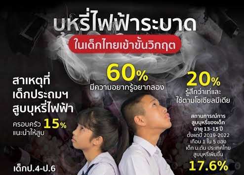 ปัจจุบันภาพลักษณ์บุหรี่ไฟฟ้าถูกสร้างให้ดู “เท่ ทันสมัย และปลอดภัย” ซึ่งเด็กและเยาวชนจำนวนมากตกเป็นเหยื่อกลยุทธ์ทางการตลาดที่ซ่อนสารเสพติดไว้ภายใต้กลิ่น รสชาติและแพ็กเกจสีสันสดใส ทั้งที่ความจริงแล้ว บุหรี่ไฟฟ้ามีสารนิโคตินปริมาณสูง ซึ่งมีฤทธิ์เสพติดรุนแรง อันตรายต่อสมองที่ควบคุมการตัดสินใจ การเรียนรู้ ความจำ และการควบคุมอารมณ์ ส่งผลให้มีสมาธิสั้นลง ความจำลดลง และเสี่ยงต่อปัญหาพฤติกรรมในระยะยาว อีกทั้ง เด็กที่สูบบุหรี่ไฟฟ้ามีโอกาสใช้ยาเสพติดมากถึง 2 เท่า นอกจากนี้ ประเทศไทยกำลังเผชิญกับปัญหาอัตราการเกิดต่ำ แต่เด็กที่เกิดมากลับต้องเติบโตในสภาพแวดล้อมที่เต็มไปด้วยสารพิษจากบุหรี่ไฟฟ้า และในบางรายได้รับผลกระทบตั้งแต่อยู่ในครรภ์ จากการสูดดมละอองไอบุหรี่ไฟฟ้า ซึ่งมีความเสี่ยงสูงต่อการคลอดก่อนกำหนด น้ำหนักตัวน้อย และมีปัญหาพัฒนาการทางสมอง สร้างความเสี่ยงต่อคุณภาพชีวิตของประชากรในอนาคต จึงขอความร่วมมือผู้ปกครอง โรงเรียน และสังคมร่วมกันเฝ้าระวัง พร้อมให้ข้อมูลที่ถูกต้องแก่เด็ก