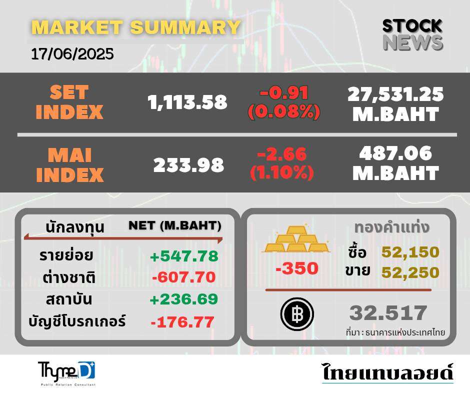 SET ปิดวันนี้ที่ 1,113.58 จุด ลดลง 0.91 จุด (-0.08%) มูลค่าซื้อขาย 27,531.25 ล้านบาท นักวิเคราะห์ฯ ระบุตลาดหุ้นไทยแกว่งกรอบแคบแทบไม่เปลี่ยนแปลง จากความไม่ชัดเจนของปัจจัยในและนอกประเทศ ทั้งความขัดแย้งอิสราเอล-อิหร่าน และการเจรจาการค้ากับสหรัฐฯ รวมถึงการปรับ ครม.ยังคลุมเครือ แม้ตลาดได้รับแรงหนุนจากหุ้นรายตัวกลุ่มท่องเที่ยว-AOT ตอบรับ “เที่ยวไทยคนละครึ่ง” คืบหน้า แนวโน้มวันพรุ่งนี้คาดภาพรวมใกล้เคียงวันนี้ นักลงทุนยังไม่กล้าตัดสินใจระหว่างรอผลประชุมเฟด ให้แนวต้าน 1,130 จุด แนวรับ 1,100 จุด