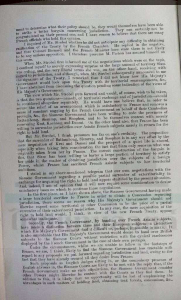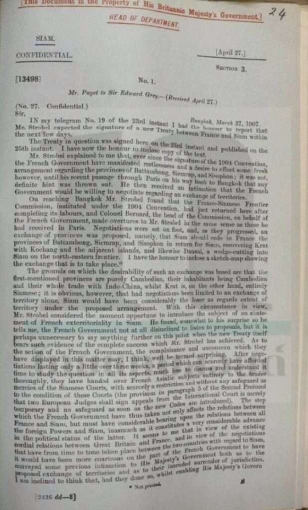 สำหรับสำเนาจดหมายที่นายเผด็จนำมาเผยแพร่ในครั้งนี้เป็นรายงานที่นาย ราล์ฟ พาเจต์ (Mr.Ralph Paget) ทูตอังกฤษประจำสยาม ขณะนั้น ส่งถึงเซอร์เอ็ดเวิร์ด เกรย์ (Sir.Edward Grey) แห่งกระทรวงการต่างประเทศอังกฤษ เมื่อวันที่ 27 มี.ค. 1907 (พ.ศ.2450) พูดถึงการลงนามในสนธิสัญญาระหว่างฝรั่งเศสกับสยาม เมื่อวันที่ 23 มี.ค. หรือเมื่อ 4 วันที่ผ่านมา โดยนายราล์ฟอ้างอิงจากข้อมูลที่เขาได้มาจากนายเอ็ดเวิร์ด เฮนรี่ สตรอเบล (Mr.Edward Henry Strobel) ซึ่งเป็นนักการทูตชาวสหรัฐ และที่เป็นที่ปรึกษาของรัฐบาลสยามประจำอยู่ที่กรุงเทพฯ โดยเนื้อหาเป็นการอธิบายว่าสนธิสัญญาดังกล่าวคืออะไร และก่อให้เกิดอะไรขึ้น รวมทั้งอาจจะส่งผลอะไรต่อสหราชอาณาจักร ซึ่งเป็นดังที่นายเผด็จสรุปเอาไว้ 3 ประการ