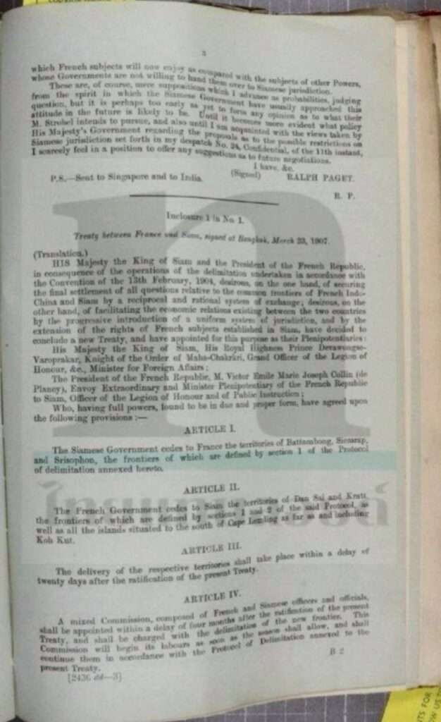 สหราชอาณาจักร, วันที่ 17 มิ.ย. จากสถานการณ์ข้อพิพาทเกี่ยวกับดินแดนระหว่างไทย-กัมพูชา ระลอกล่าสุด นายเผด็จ ขำเลิศสกุล นักวิจัยประวัติศาสตร์เอเชียตะวันออกเฉียงใต้ ประจำหอจดหมายเหตุแห่งชาติ สหราชอาณาจักร (The National Archives, UK) ซึ่งเป็นผู้ค้นพบเอกสารสำคัญหลายชิ้นเกี่ยวกับประวัติศาสตร์ไทย ได้เผยแพร่เอกสารทางประวัติศาสตร์ที่หายากชุดใหม่ โดยเขาระบุว่าคือข้อความฉบับเต็มของสนธิสัญญาฝรั่งเศส-สยาม รศ.125 (Franco-Siamese Treaty1907) พร้อมรายงานทางการทูตของอังกฤษ และแผนที่ร่างที่แสดงรายละเอียดเขตแดนระหว่างสยามกับอินโดจีนของฝรั่งเศส บันทึกเหล่านี้ได้กำหนดเขตแดนที่เรารู้จักในปัจจุบัน ซึ่งมีอิทธิพลต่อภูมิทัศน์ทางภูมิรัฐศาสตร์สมัยใหม่