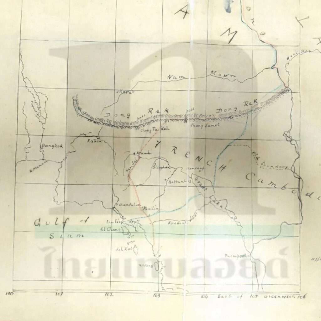 นักวิจัยจากหอจดหมายเหตุอังกฤษ กล่าวว่า น้ำไซก่อตัวเป็นแนวชายแดนที่บรรจบกับแม่น้ำศรีโสภณ ซึ่งต่อมากลายเป็นแนวเขตที่อยู่ห่างจากเมืองอรัญลงไป 10 กิโลเมตร (ตามลำน้ำ) จากนั้นจึงแบ่งเขตแดนเป็นเส้นตรงไปยังจุดที่ตั้งอยู่บนแม่น้ำดงรักระหว่างช่องเขาช่องตะโก (Chong-Ta-Koh) และ ช่องเสม็ด (Chong-Samet) จากนั้นจึงเป็นสันปันน้ำของแม่น้ำดงรัก