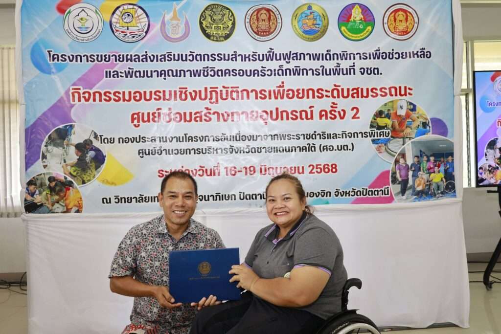 จังหวัดปัตตานี วันที่ 19 มิถุนายน นายแพทย์ สมหมาย บุญเกลี้ยง ผู้ช่วยเลขาธิการศูนย์อำนวยการบริหารจังหวัดชายแดนภาคใต้ (ศอ.บต.) เป็นประธานในพิธีปิดและมอบเกียรติบัตร กิจกรรมอบรมเชิงปฏิบัติการเพื่อยกระดับสมรรถนะศูนย์ซ่อมสร้างกายอุปกรณ์ ครั้งที่ 2 ซึ่งจัดขึ้นระหว่างวันที่ 16-19 มิถุนายน 2568 โดยมี ผู้ปฏิบัติงานประจำศูนย์ซ่อมสร้างกายอุปกรณ์ เข้ารับการฝึกอบรม จำนวน 40 คน และมี คณะวิทยากรจาก สถาบันพัฒนาการเด็กราชนครินทร์ โครงการ RICD Wheelchair project มาถ่ายทอดความรู้ เทคนิค และวิธีการให้แก่ ผู้เข้ารับการฝึกอบรมฯ