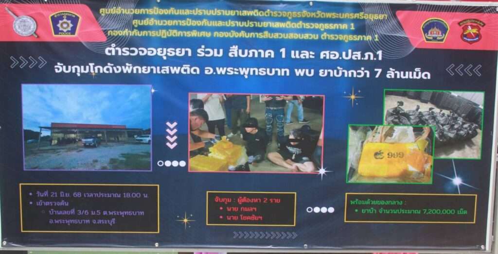 คดีที่ 2 จับกุมยำบัา7.2 ล้านเม็ด ที่โกดังแหล่งพักยำเสพติดในพื้นที่ อ.พระพุทธบาท จ.สระบุรี คดีนี้สืบเนื่องจากเมื่อวันที่ 7 พ.ค.68 เวลาประมาณ 06.10 น. เจ้าหน้าที่ตำรวจได้เข้าตรวจค้นบ้านหลังหนึ่งซึ่งเป็นแหล่งพักยาเสพติดในพื้นที่ ต.ราชคราม อ.บางไทร จ.พระนครศรีอยุธยา ผลการตรวจค้นพบยาบ้า 40 กระสอบ คิดเป็นจ านวนยาบ้าประมาณ 8,732,000 เม็ด และยาไอซ์ 18 กระสอบ น้ำหนักรวมประมาณ 720 กิโลกรัม และจับกุมผู้ต้องหาได้ 1 คน หลังจากนั้นเจ้าหน้าที่ชุดปฏิบัติการป้องกันปราบปรามยาเสพติดตำรวจภูธรภาค 1 ชุดที่ 1 น าโดย พ.ต.อ.จักรพันธ์ โอสถากันต์ ผกก.ปพ.บก.สส.ภ.1 และชุดขยายผลฯ ศอ.ปส.ภ.จว.พระนครศรีอยุธยา ได้ร่วมกันทำการสืบสวนขยายผลอย่างต่อเนื่อง จนกระทั่งทราบว่า เครือข่ายของแหล่งพักยาเสพติด ต.ราชคราม ดังกล่าว ได้ไปรับยาเสพติดมาจากภาคเหนือ และมาเช่าโกดังซึ่งอยู่ที่บริเวณ ริมถนนพหลโยธิน อ.พระพุทธบาท จ.สระบุรี ไว้เพื่อรอรับยาเสพติดเตรียมส่งต่อให้แก่ลูกค้าในพื้นที่ภาคกลาง เจ้าหน้าที่ต ารวจจึงได้เฝ้าติดตามพฤติการณ์ของเครือข่ายดังกล่าวตลอดมา จนกระทั่งในวันที่ 21 มิ.ย.68 เวลาประมาณ 18.00 น. เจ้าหน้าที่ตำรวจนำโดย พ.ต.อ.จักรพันธ์