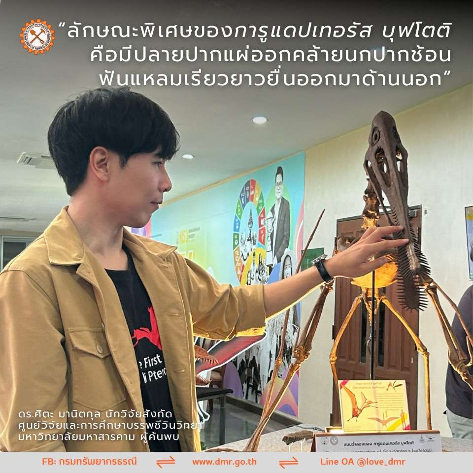 สระแก้ว, วันที่ 24 มิ.ย. – กรมทรัพยากรธรณี (ทธ.) เปิดเผยข่าวดีว่า ทีมนักวิจัยค้นพบ “การูแดปเทอรัส บุฟโตติ” (Garudapterus buffetauti) เทอโรซอร์ชนิดใหม่ของโลกและเป็นชนิดแรกที่พบในประเทศไทย จากแหล่งซากดึกดำบรรพ์พระปรง จังหวัดสระแก้ว ซากดึกดำบรรพ์ หรือฟอสซิลชิ้นสำคัญคือส่วนปลายขากรรไกรบนจากชั้นหินหมวดเสาขัว อายุราว 130 ล้านปี แม้เทอโรซอร์ไม่ใช่ไดโนเสาร์เจ้าแห่งพื้นดินแต่โดดเด่นไม่แพ้กันเพราะเป็นสัตว์เลื้อยคลานที่วิวัฒนาการสามารถบินได้เป็นกลุ่มแรกของโลก ซึ่งมีขนาดตั้งแต่ตัวเท่านกน้อยไปจนถึงสูงใหญ่เท่ายีราฟ