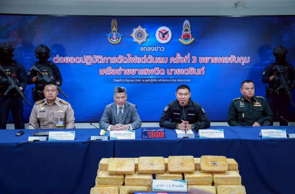 ตนได้มอบหมายให้ นายปฤณ เมฆานันท์ ผู้อำนวยการสำนักปราบปรามยาเสพติด สั่งการเจ้าหน้าที่สืบสวนขยายผลพิสูจน์ทราบเครือข่ายที่ลำเลียงยาเสพติดของนายเตชินท์ฯ อย่างต่อเนื่อง กระทั่งพบรถยนต์ต้องสงสัยที่คาดว่าจะใช้ในการลำเลียงยาเสพติด (รถยนต์ของกลางที่ใช้บรรทุกยาเสพติด) จึงดำเนินการสืบสวนติดตามพฤติการณ์เรื่อยมา จนพบว่าในห้วงสัปดาห์ที่ผ่านมาของเดือนมิถุนายน 2568 รถคันดังกล่าวเดินทางจากพื้นที่ภาคเหนือมุ่งหน้าเข้าสู่พื้นที่ภาคกลาง เจ้าหน้าที่จึงสนธิกำลังไปตรวจสอบหารถคันดังกล่าว กระทั่งวันเสาร์ที่ 21 มิถุนายน 2568 เวลาประมาณ 02.00 น. สำนักปราบปรามยาเสพติด สำนักงาน ป.ป.ส. ร่วมกับ ขกท.ทบ., ศูนย์รักษาความปลอดภัย กองบัญชาการกองทัพไทย และ นสร. พบรถกระบะบรรทุกแบบคอก อำพรางด้วยสินค้าเกษตร มีลักษณะต้องสงสัย จึงขอทำการการตรวจค้น ผลการตรวจค้น สามารถจับกุมผู้ต้องหา 2 คน (ชาว จ.พะเยา) พร้อมยาบ้า 1.3 ล้านเม็ด บรรทุกอยู่ท้ายกระบะ เหตุเกิดในพื้นที่ จ.พิจิตร ต่อมาเจ้าหน้าที่ได้ขออนุมัติครอบครองยาเสพติดภายใต้การควบคุม (CD) เพื่อขยายผลจับกุมผู้รับยาเสพติดปลายทาง กระทั่งวันอาทิตย์ที่ 22 มิถุนายน 2568 เวลาประมาณ 06.45 น. สามารถขยายผลจับกุมผู้ต้องหาอีก 2 คน (ชาว จ.ระยอง) ขณะมารับยาเสพติด เหตุเกิดในพื้นที่ ต.บางใหญ่ จ.นนทบุรี จากนั้น เจ้าหน้าที่ขยายผลตรวจค้นบ้านพักผู้ต้องหารวม 4 จุด (จ.พะเยา, จ.ระยอง) ผลการตรวจค้น พบ ยาบ้า 39 เม็ด (ที่บ้านพักของผู้ต้องหาชาวระยองที่มารับยาเสพติด) และตรวจยึดอายัดทรัพย์สิน อาทิเช่น ที่ดินพร้อมสิ่งปลูกสร้าง 2 แปลง รถยนต์ 1 คัน รวมมูลค่าประมาณ 2,550,000 บาท