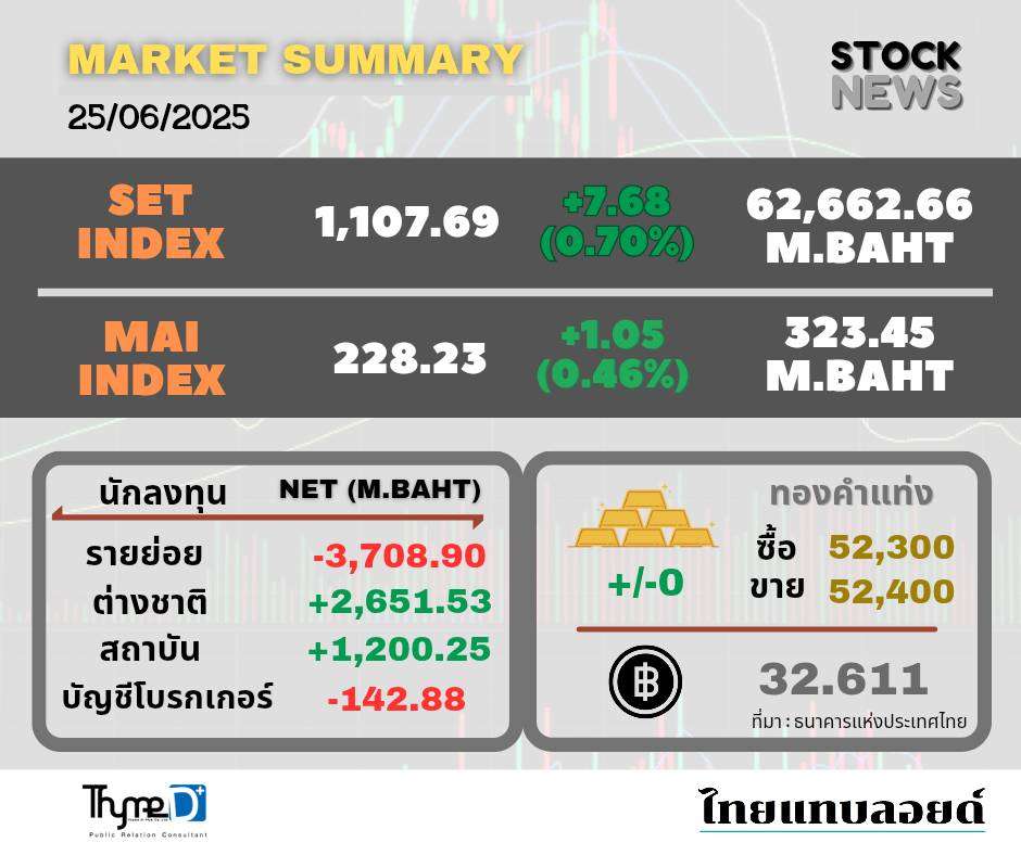 SET ปิดวันนี้ที่ 1,107.69 จุด เพิ่มขึ้น 7.68 จุด (+0.70%) มูลค่าซื้อขาย 62,662.66 ล้านบาท นักวิเคราะห์เผยตลาดหุ้นไทยวันนี้บวกต่อเนื่องตามตลาดภูมิภาค บรรยากาศลงทุนดีขึ้นหลัง กนง.คงดอกเบี้ย-ปรับเพิ่มคาดการณ์ GDP ปีนี้ แม้ลดปีหน้าเหลือ 1.7% โดยหุ้นดีดขึ้นวันนี้เป็นหุ้นที่ลงไปแรง มองเป็นเก็งกำไรระยะสั้นไม่ได้มาจากปัจจัยพื้นฐาน นอกจากนี้ ดัชนีปิดเที่ยงยืนเหนือ 1,094 จุดส่งผลให้ตลาดกลับเป็นขาขึ้น พรุ่งนี้คาดยังไปต่อได้ ให้แนวต้านแรกขึ้นทดสอบ 1,125 จุด ถัดไป 1,133 และ 1,166 จุด ส่วนแนวรับอยู่ที่ 1,100 จุด