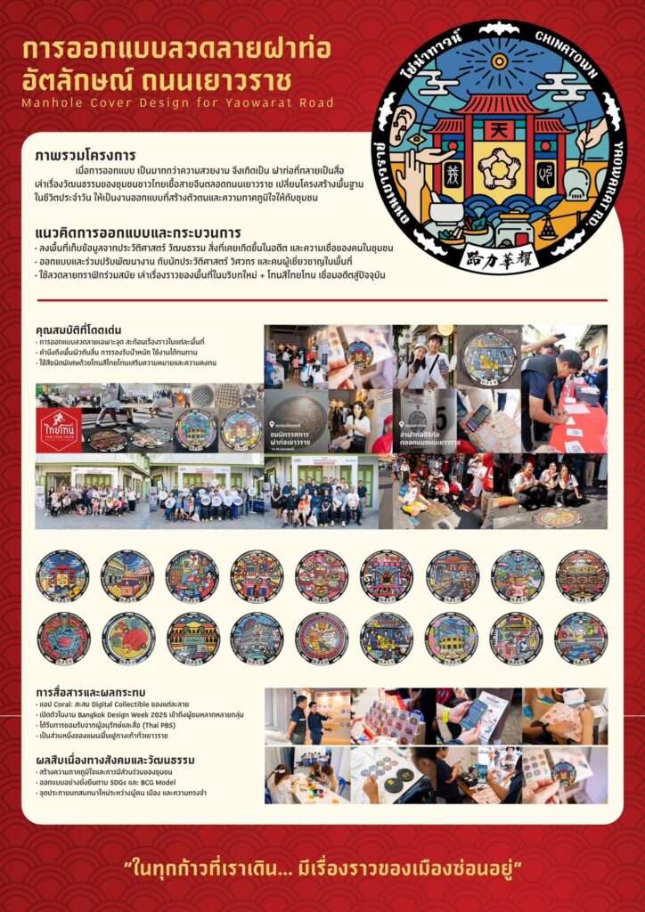 ลวดลายฝาท่อสื่อสารเรื่องราวของชุมชนเยาวราช ตลาดน้อย และวิถีชีวิตผู้คนในไชน่าทาวน์ ผ่านกระบวนการมีส่วนร่วมกับชุมชน โดยมีทีมที่ปรึกษา ได้แก่ คุณวิศิษฐ์ เตชะเกษม, คุณสมชัย กวางทองพานิชย์, คุณปรีดา ปรัตถจริยา, คุณนิธิวุฒิ ศรีบุญชัยชูสกุล และ ดร.ไพโรจน์ พิทยเมธี