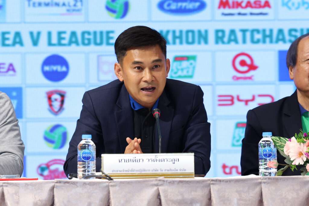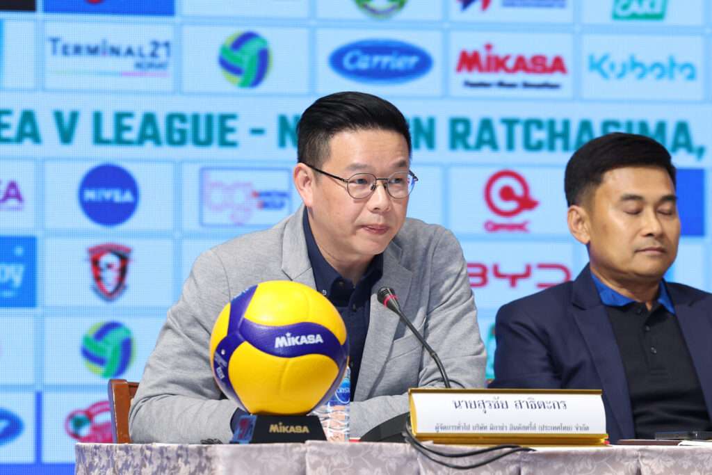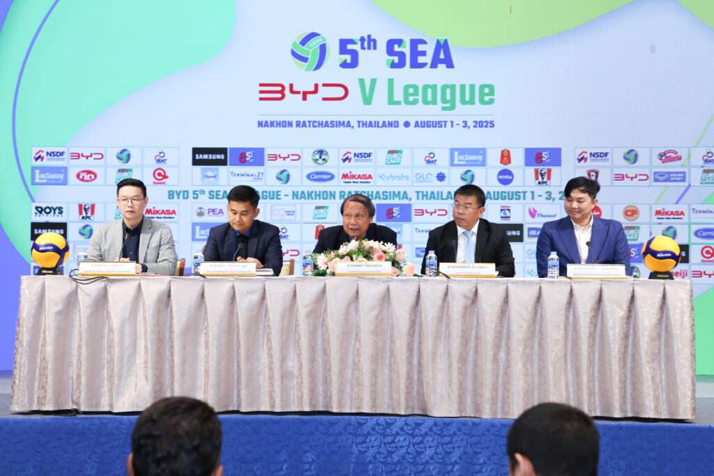 นายสมพร ใช้บางยาง นายกสมาคมกีฬาวอลเลย์บอลแห่งประเทศไทย พร้อมด้วย เรืออากาศโทชาญฤทธิ์ วงษ์ประเสริฐ รองประธานกิตติมศักดิ์ตลอดชีพ สหพันธ์วอลเลย์บอลแห่งเอเชีย, นายกิตติศักดิ์ ธีระวัฒนา รองผู้ว่าราชการจังหวัดนครราชสีมา, นายสุรชัย สาธิตะกร ผู้จัดการทั่วไป บริษัท มิกาซ่า อินดัสตรี้ส์ (ประเทศไทย) จำกัด, นายเดียว วรตั้งตระกูล ประธานเจ้าหน้าที่ฝ่ายปฏิบัติการ บริษัท วัน สามสิบเอ็ด จำกัด และ นายเกรียงไกร วิไลลักษณ์ ผู้ช่วยผู้อำนวยการฝ่ายการตลาด ศูนย์การค้าเทอร์มินอล 21 โคราช ร่วมกันแถลงข่าวการจัดการแข่งขัน วอลเลย์บอลหญิง บีวายดี ซี วี ลีก 2025 (BYD SEA V League 2025) ที่ห้องบุหงา โรงแรมโกลเด้นทิวลิป ซอฟเฟอรีน เมื่อวันที่ 26 มิ.ย.ที่ผ่านมา