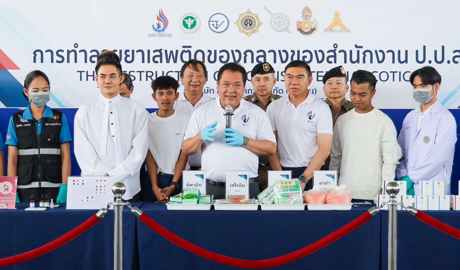 พล.ต.ท.ภาณุรัตน์ หลักบุญ เลขาธิการ ป.ป.ส. เผยว่า สำหรับผลการดำเนินงานที่ผ่านมาจนถึงปัจจุบัน (ปีงบประมาณ 2567-2568) ของสำนักงาน ป.ป.ส. ภายใต้รัฐบาลชุดปัจจุบัน ได้ทำลายยาเสพติดไปแล้ว รวม 4 ครั้ง จาก 442 คดี คิดเป็นยาเสพติดของกลางรวมสิ่งห่อหุ้มถึง 109.48 ตัน (น้ำหนักสุทธิยาเสพติดของกลาง 92.44 ตัน) เป็นยาบ้า กว่า 540 ล้านเม็ด ไอซ์ 36.98 ตัน เฮโรอีน 1.36 ตัน และยาเสพติดประเภทอื่นๆ เช่น คีตามีน, โคคาอีน, เอ็มดีเอ็มเอ (ยาอี) และสารผสม (Happy Water) โดยกระบวนการทำลายยาเสพติดทั้งหมด อยู่ภายใต้การกำกับดูแลอย่างเข้มงวดของคณะทำงานซึ่งประกอบด้วยผู้แทนจากหลายหน่วยงาน อาทิ สำนักงานคณะกรรมการอาหารและยา, กองบัญชาการตำรวจปราบปรามยาเสพติด, กรมวิทยาศาสตร์การแพทย์, สำนักงานพิสูจน์หลักฐานตำรวจ และหน่วยงานตำรวจทหารในพื้นที่ เพื่อรับประกันความโปร่งใส ถูกต้องครบถ้วน โดยยาเสพติดทั้งหมดจะถูกเผา ด้วยเทคโนโลยีเตาเผาอุณหภูมิสูงกว่า 1,200 องศาเซลเซียส ซึ่งสามารถทำลายฤทธิ์ยาเสพติดได้อย่างสมบูรณ์และไม่ส่งผลกระทบต่อสิ่งแวดล้อม