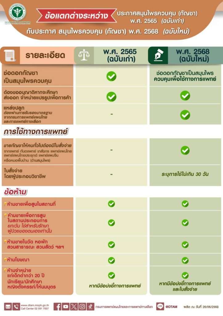 1.ประกาศฉบับเดิม ใครจะซื้อก็ได้ ไม่ต้องมีใบสั่งจ่าย ยกเว้นเด็ก สตรีมีครรภ์ หญิงให้นมบุตรและนักศึกษาไม่ได้กำกับว่า การใช้ต้องใช้ทางการแพทย์ผ่านใบสั่งแพทย์ ทำให้มีการใช้ในเชิงสันทนาการเยอะ ประกาศฉบับใหม่ต่างจากเดิมเข้มงวดมากขึ้น มีเจตนาที่ชัดเจนว่า ต้องการทำให้เข้าถึงกัญชายากขึ้น แม้กระทั่งบุคคลทั่วไปยังไม่สามารถที่จะซื้อกัญชาได้โดยเสรี แต่ต้องผ่านการพิจารณาจากแพทย์ ในการออกใบสั่งแพทย์คนเข้าถึงได้คือทางการแพทย์เท่านั้น การจำหน่ายกัญชาในร้าน ต้องมีใบสั่งจ่าย จาก แพทย์ ,แพทย์แผนไทย, แพทย์แผนจีน, ทันตแพทย์, เภสัชกร หรือหมอพื้นบ้าน ถ้าดูจากสถานประกอบกิจการที่ขึ้นทะเบียนขออนุญาตใช้กัญชาทั้งหมดประมาณ 1.8 หมื่นแห่ง เป็นสถานพยาบาลเพียง 19 แห่งเท่านั้น ก่อนประกาศใช้ประกาศฉบับใหม่ การเปิดรับฟังความคิดเห็น 25 วัน (22 พฤษภาคม – 15 มิถุนายน 2568) มีผู้แสดงความเห็นกว่า 1.6 หมื่นคน เห็นด้วย 59 % ไม่เห็นด้วย 41 %