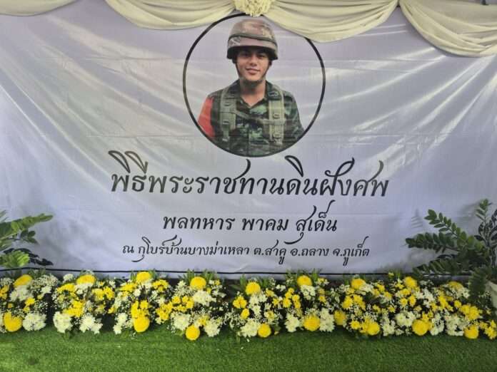 ที่ กุโบร์มุสลิมบ้านบางม่าเหลา จังหวัดภูเก็ต วันที่ 26 มิถุนายน – พระบาทสมเด็จพระเจ้าอยู่หัว ทรงพระกรุณาโปรดเกล้าฯ พระราชทานดินไปในการฝังศพเป็นกรณีพิเศษแก่ พลทหาร พาคม สุเด็น อายุ 22 ปี ผู้เสียชีวิตจากเหตุการณ์คนร้ายลอบยิงเจ้าหน้าที่ทหาร ชุดปฏิบัติจรยุทธ์ กองพันทหารราบที่ 1 ขณะลาดตระเวนดูแลรักษาความปลอดภัยในพื้นที่บ้านวังหิน หมู่ที่ 8 ตำบลบันนังสตา อำเภอบันนังสตา จังหวัดยะลา เมื่อวันที่ 17 มิถุนายน 2568 ที่ผ่านมา