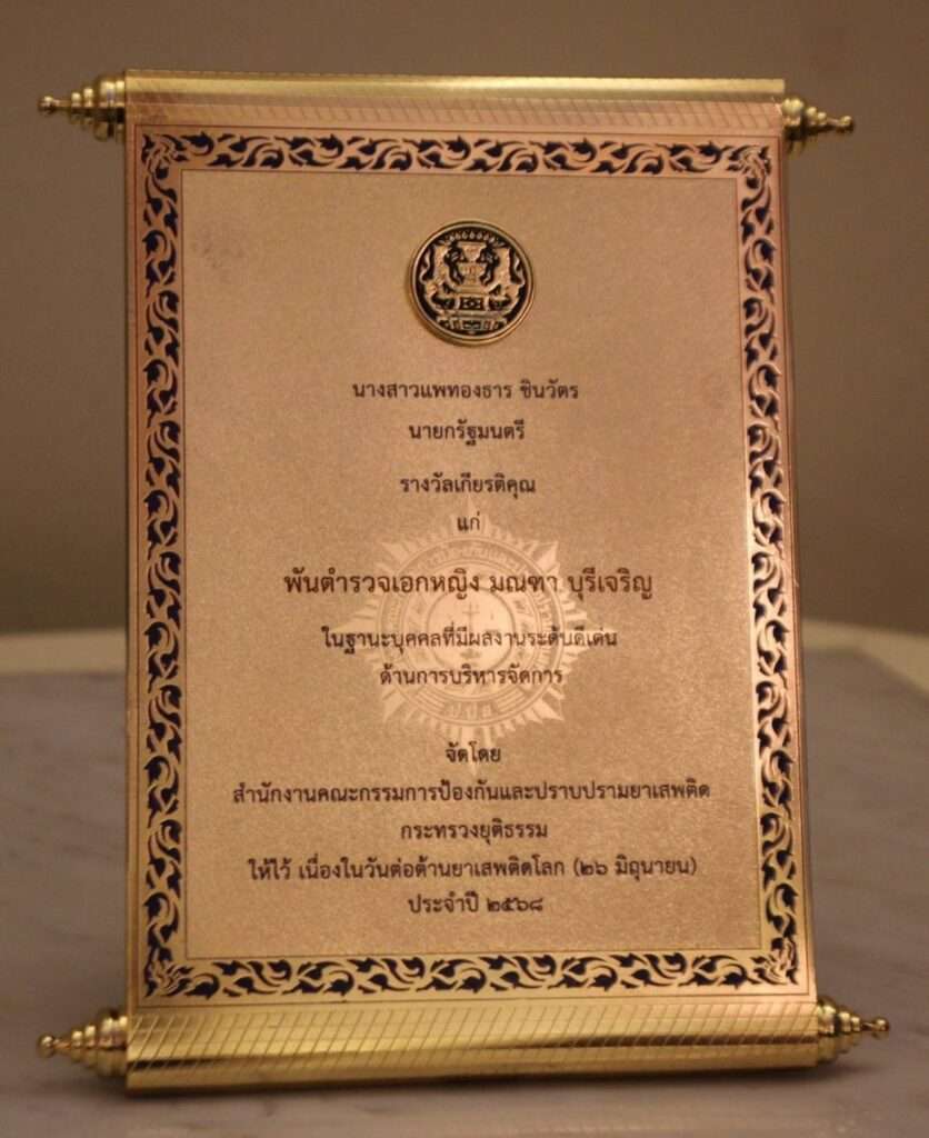 “พ.ต.อ.หญิง มณฑา” คว้ารางวัลเกียรติคุณวันต่อต้านยาเสพติดโลก ยกย่องผลงานบริหารจัดการดีเด่น