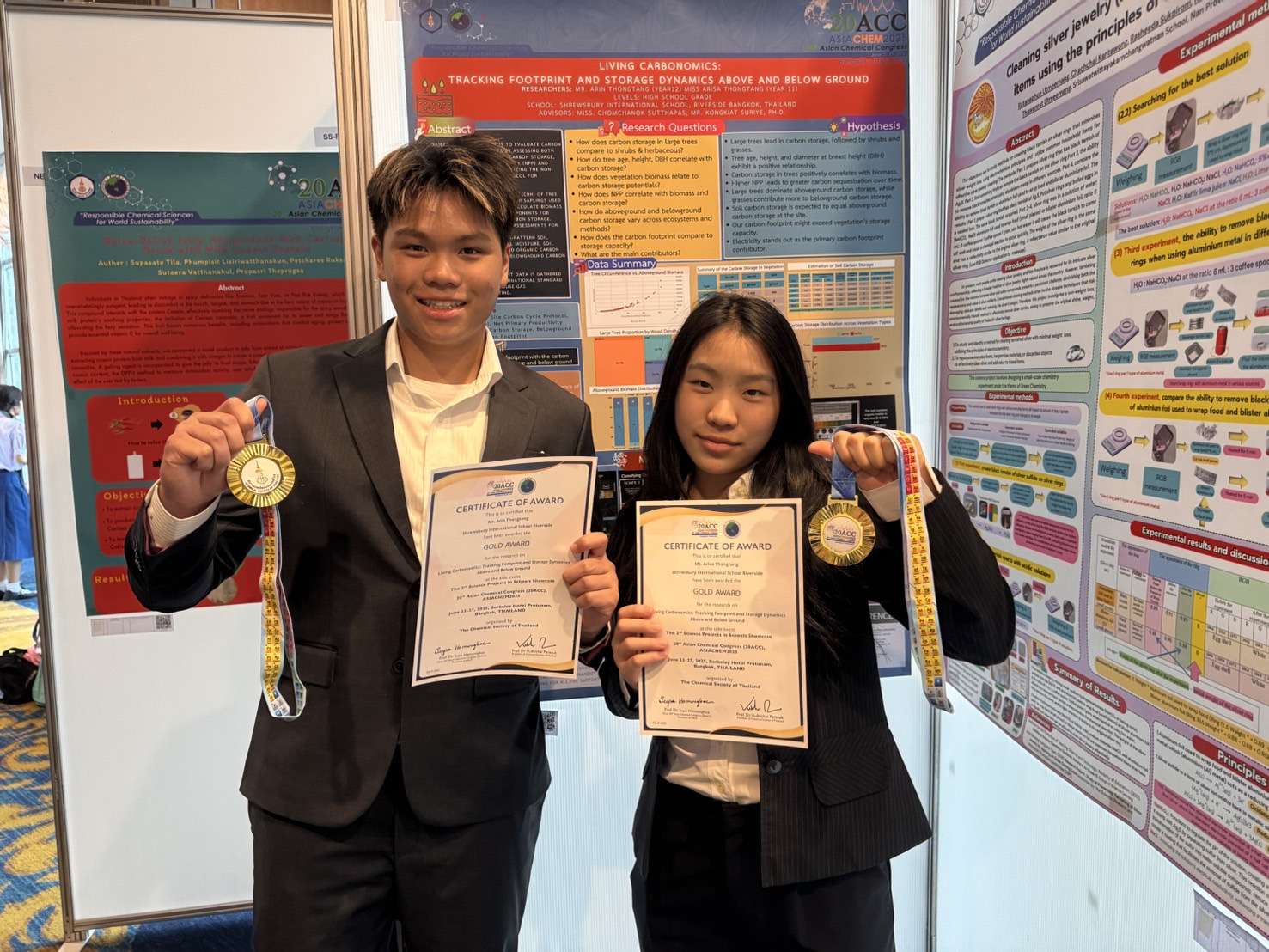 วันพฤหัสบดี ที่ 26 มิถุนายน 2568 นาย อริณชย์ ทองแตง (อิน) และ นางสาว อริสา ทองแตง (เอม) นักเรียน year 12 และ 11 จากโรงเรียนนานาชาติโชรส์เบอรี กรุงเทพเข้าร่วมการประกวด 20th Asian Chemical Congress (20ACC), ASIACHEM2025 ซึ่งได้รับรางวัลระดับเหรียญทอง ในหัวข้อ Living Carbonomics: Tracking Footprint and Storage Dynamics Above and Below Ground โดยมีรัฐมนตรีว่าการกระทรวงศึกษาธิการ พลตำรวจเอกเพิ่มพูน ชิดชอบ เป็นประธานในพิธี