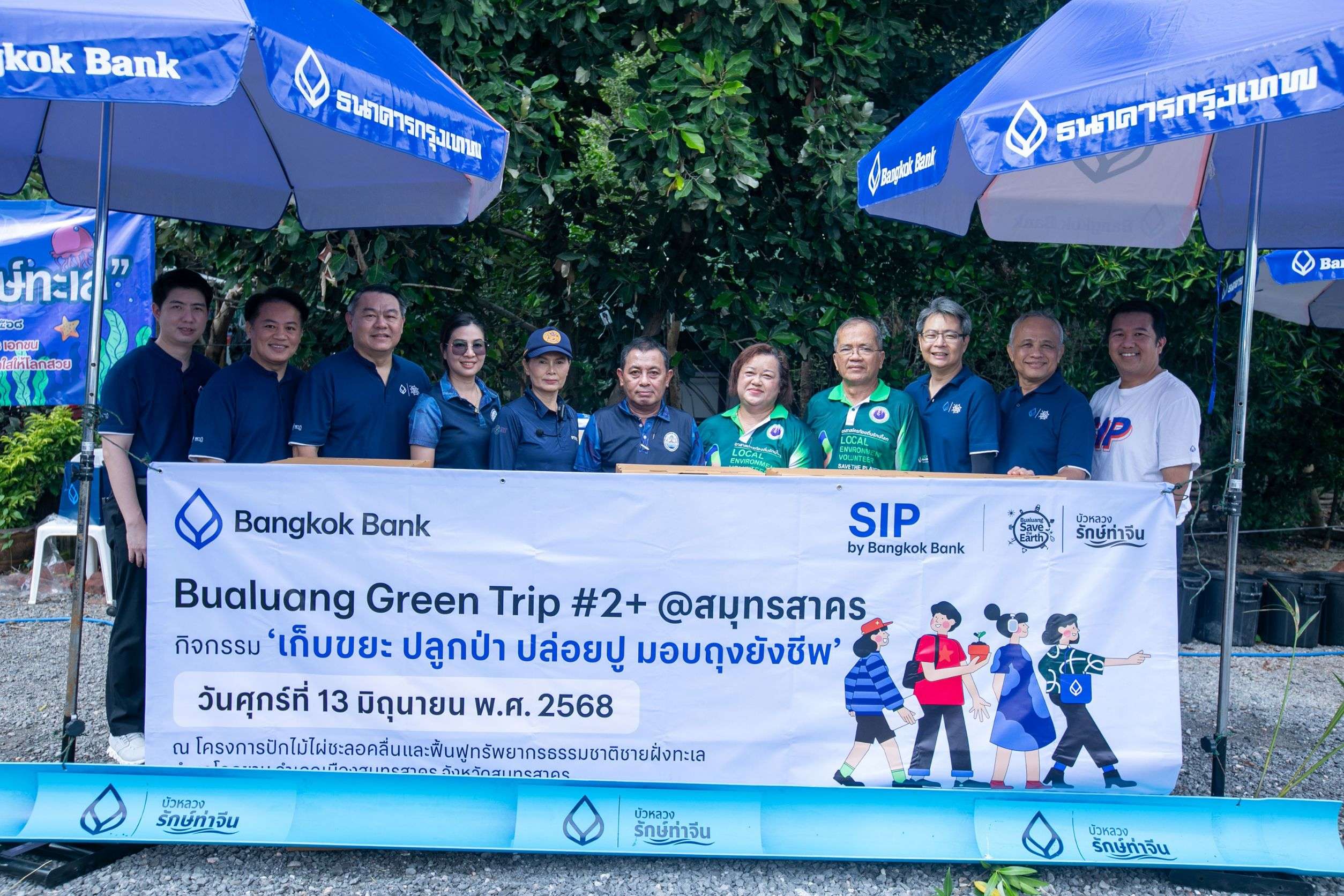 ธนาคารกรุงเทพ ในฐานะ “เพื่อนคู่คิด มิตรคู่บ้าน” นำโดย ดร.จิระวัฒน์ ปั้นเปี่ยมรัษฎ์ เจ้าหน้าที่บริหารระดับ Vice President ฝ่ายผู้จัดการใหญ่ นายอภิวัฒน์ ปุณโณปกรณ์ นายสุวิทย์ อินทรเฉลิม เจ้าหน้าที่บริหารระดับ Vice President ฝ่ายการประชาสัมพันธ์ และ นายสาโรจน์ โรจนสาโรจน์ ผู้จัดการภาค 3 ลูกค้าธุรกิจรายกลาง ต่างจังหวัด พร้อมด้วยคณะผู้บริหาร พนักงานสมาชิก “Bualuang Green Team” และนักศึกษาโครงการฝึกอบรมพิเศษ “ธนาคารคู่บ้านคู่เมือง” (Student Internship Program หรือ SIP) รุ่น78 ร่วมกิจกรรม Bualuang Green Trip ครั้งที่ 2 “เก็บขยะ ปลูกป่า ปล่อยปู มอบถุงยังชีพ” ณ โครงการปักไม้ไผ่ชะลอคลื่นและฟื้นฟูทรัพยากรธรรมชาติชายฝั่งทะเล ตำบลโคกขาม อำเภอเมืองสมุทรสาคร จังหวัดสมุทรสาคร ซึ่งได้ร่วมกับองค์กรบริหารส่วนตำบลโคกขาม และสำนักงานทรัพยากรทางทะเลและชายฝั่งที่ 8 เพื่อปลูกจิตสำนึกสร้างการมีส่วนร่วมในการอนุรักษ์และหวงแหนสิ่งแวดล้อมและความรับผิดชอบต่อสังคม ได้แก่ กิจกรรมปล่อยปู เพื่อฟื้นฟูระบบนิเวศและประชากรปูในธรรมชาติ กิจกรรมปลูกป่าชายเลน จำนวน 1000 ต้น เพื่อสร้างแนวป้องกันการกัดเซาะชายฝั่งและเป็นแหล่งอนุบาลสัตว์น้ำ เช่น กุ้ง ปูและปลา กิจกรรมเก็บขยะบริเวณริมฝั่งป่าชายเลน เพื่อรักษาสิ่งแวดล้อมและลดผลกระทบต่อสัตว์น้ำและพืชได้จำนวน 1,250 กิโลกรัม พร้อมกันนี้ธนาคารยังได้มอบอุปกรณ์ปล่อยพันธุ์ปู ชุดถังขยะแยกประเภท ให้กับองค์การบริหารส่วนตำบลโคกขาม สำหรับนำไปใช้ในการทำกิจกรรมในพื้นที่ พร้อมมอบถุงยังชีพสิ่งของจำเป็นในชีวิตประจำวันให้กับผู้ป่วยติดเตียงในพื้นที่
